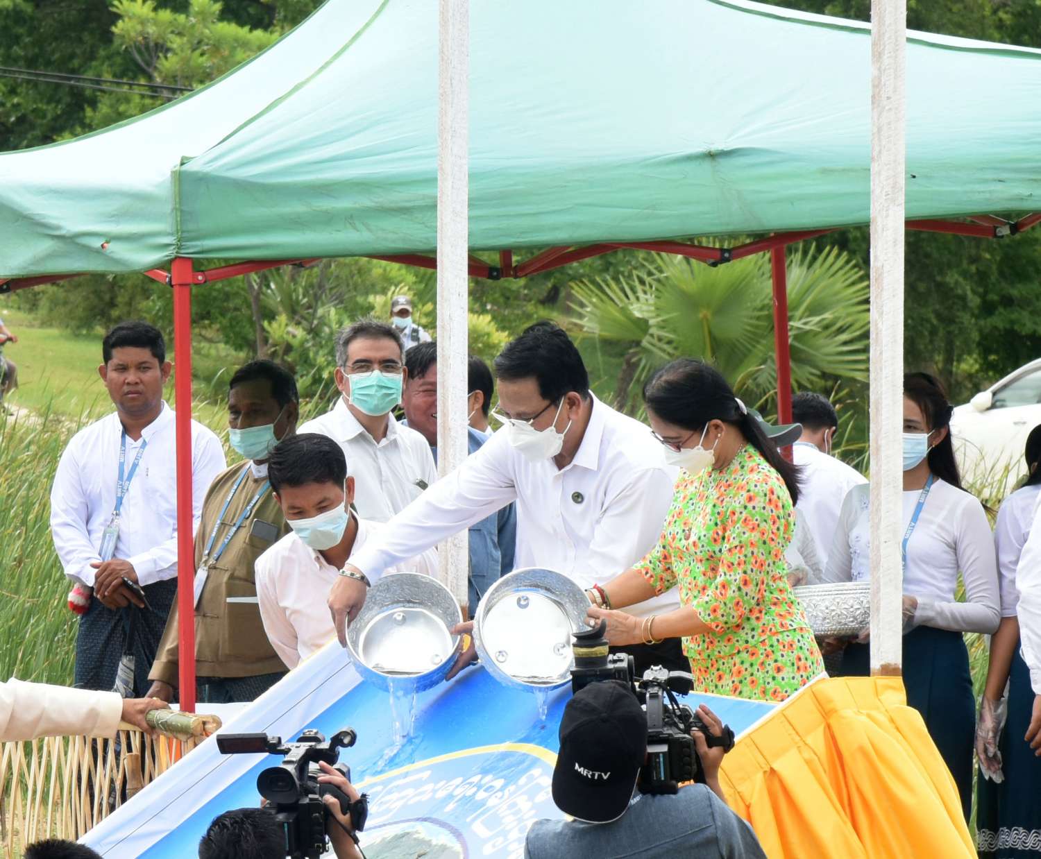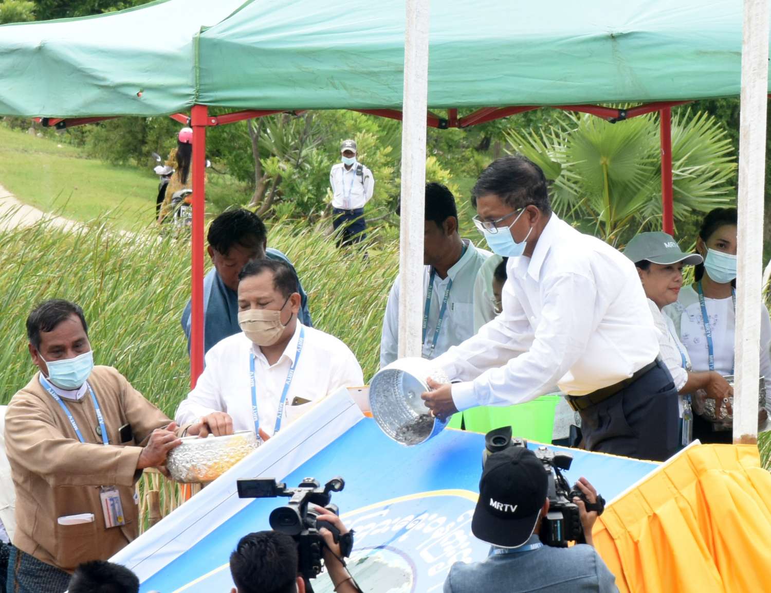 ယင်းနောက် ငါးမျိုးစိုက်ထည့်ခြင်းအခမ်းအနားကို ဆက်လက်ကျင်းပရာ ပြည်ထောင်စုဝန်ကြီးနှင့်ဇနီးတို့က ငါးမွေးမြူရေးကန်အတွင်းသို့ ထိုင်ဝမ်ငါးခူ ငါးသားပေါက်များကို စိုက်ထည့်ပေးကြသည်။