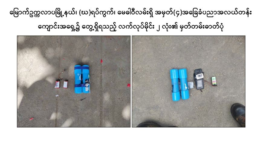 အလားတူ ဇွန်လ ၁၆ ရက် နံနက် ၁၀ နာရီ ၂၀ မိနစ်ခန့်တွင် ရန်ကုန်တိုင်းဒေသကြီး၊ မြောက်ဥက္ကလာပမြို့နယ်၊ (ဃ)ရပ်ကွက်၊ မေဓါဝီလမ်းရှိ အမှတ်(၄)အခြေခံပညာအလယ်တန်းကျောင်းအရှေ့၌ မသင်္ကာဖွယ်အထုပ်တစ်ထုပ်တွေ့ရှိကြောင်း သတင်းအရ လုံခြုံရေးတပ်ဖွဲ့ဝင်များက သွားရောက်စစ်ဆေးခဲ့ရာ အဆိုပါကျောင်းဝင်ပေါက်အနီးတွေ့ရသည့် မသင်္ကာဖွယ်အထုပ်အတွင်းမှ PVC ပိုက်ဖြင့် ပြုလုပ်ထားသည့်လက်လုပ်မိုင်း ၂ လုံးအား Keypad ဖုန်း ၁ လုံး၊ ဓာတ်ခဲ ၁ လုံး တို့ဖြင့်ချိတ်ဆက်ထားသည်ကို တွေ့ရှိရသဖြင့် သက်မဲ့ပြုလုပ်သိမ်းဆည်းခဲ့ကြောင်း သိရသည်။