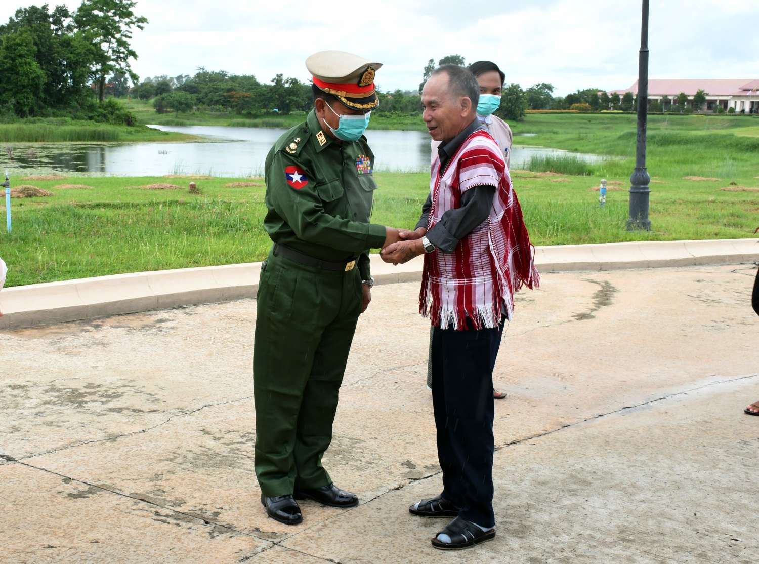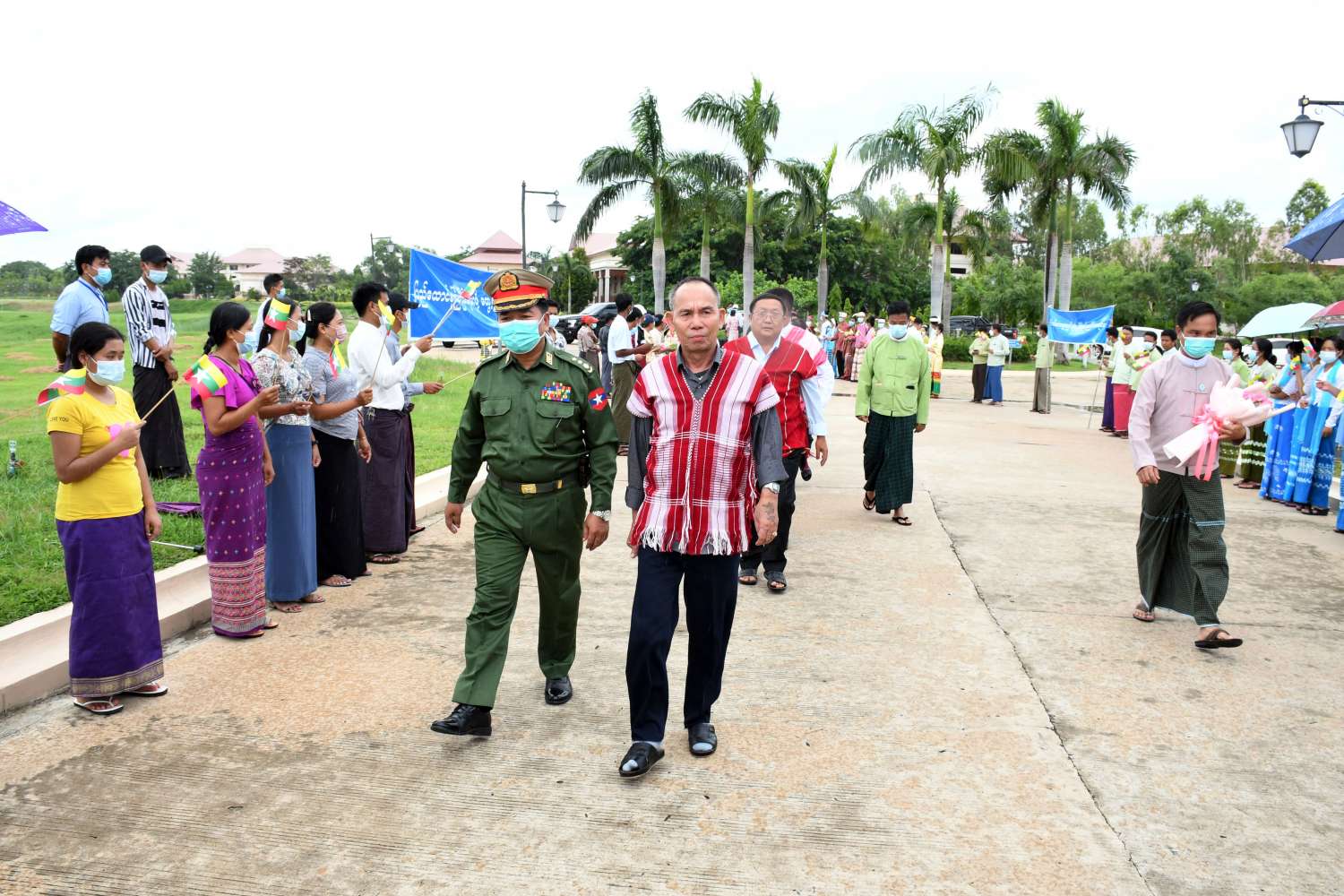 အဆိုပါ ငြိမ်းချမ်းရေးကိုယ်စားလှယ်အဖွဲ့အား အမျိုးသားစည်းလုံးညီညွတ်ရေးနှင့် ငြိမ်းချမ်းရေး ဖော်ဆောင်မှု ညှိနှိုင်းရေးကော်မတီအဖွဲ့ဝင်နှင့် တာဝန်ရှိသူများ၊ သာသနာရေးနှင့် ယဉ်ကျေးမှု ဝန်ကြီးဌာန၊ အနုပညာဦးစီးဌာနမှ တိုင်းရင်းသားတိုင်းရင်းသူများ၊ ဌာနဆိုင်ရာဝန်ထမ်းများ၊ ငြိမ်းချမ်းရေးကိုလိုလားသည့် ဒေသခံပြည်သူများက ထာဝရငြိမ်းချမ်းရေးကို ရရှိရေးသည် ပြည်သူတစ်ရပ်လုံး၏ ဆန္ဒအစစ်အမှန်ဖြစ်သည်၊ ငြိမ်းချမ်းရေး ရရှိရေးသည် နိုင်ငံသားအားလုံး၏ ဆန္ဒအမှန်ဖြစ်သည်၊ ပြည်ထောင်စုကြီး ငြိမ်းချမ်းဖို့ တွေ့ဆုံဆွေးနွေးကြပါစို့၊ တိုင်းရင်းသားတွေ စည်းလုံးမှ ငြိမ်းချမ်းတည်ငြိမ်အေးချမ်းရ စသည့်စာသားပါ ဆိုင်းဘုတ်များနှင့် နိုင်ငံတော် အလံငယ်များကို ကိုင်ဆောင်၍ ကြိုဆိုကြသည်။