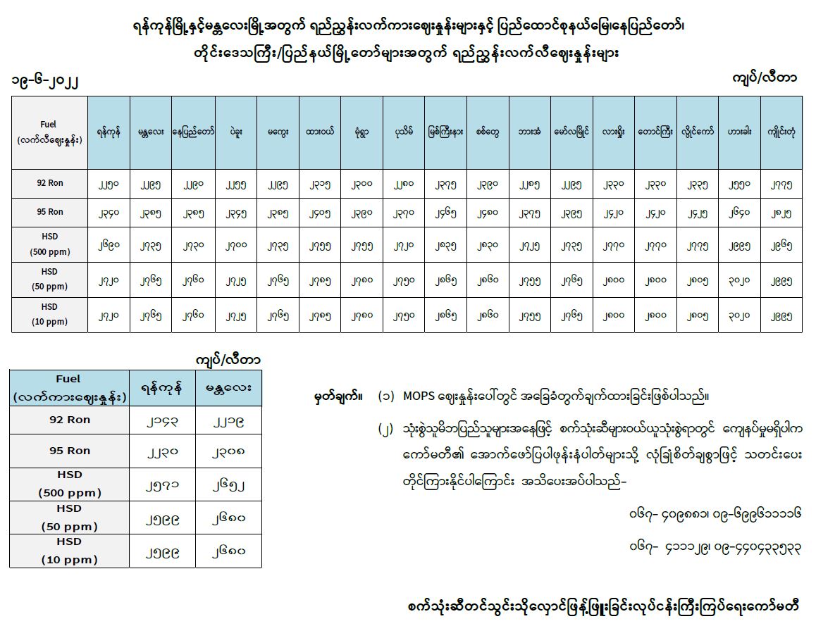 ရန်ကုန်မြို့နှင့် မန္တလေးမြို့အတွက် ရည်ညွှန်းလက်ကားဈေးနှုန်းများနှင့် ပြည်ထောင်စုနယ်မြေ၊ နေပြည်တော်၊ တိုင်းဒေသကြီး/ပြည်နယ်မြို့တော်များအတွက် ရည်ညွှန်းလက်လီဈေးနှုန်းများ 06/18/2022