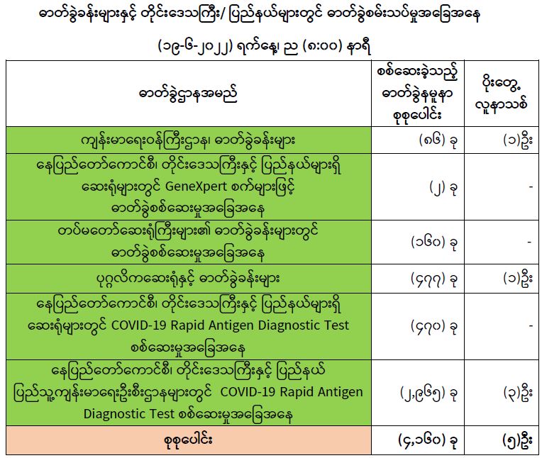 သို့ဖြစ်ပါ၍ ယနေ့အထိ ဓာတ်ခွဲနမူနာစုစုပေါင်း (၈,၃၁၇,၀၉၉) ခုအားစစ်ဆေးခဲ့ပြီး COVID-19 ဓာတ်ခွဲအတည်ပြုလူနာ စုစုပေါင်း (၆၁၃,၄၉၀) ဦး ရှိပြီဖြစ်ပါသည်။