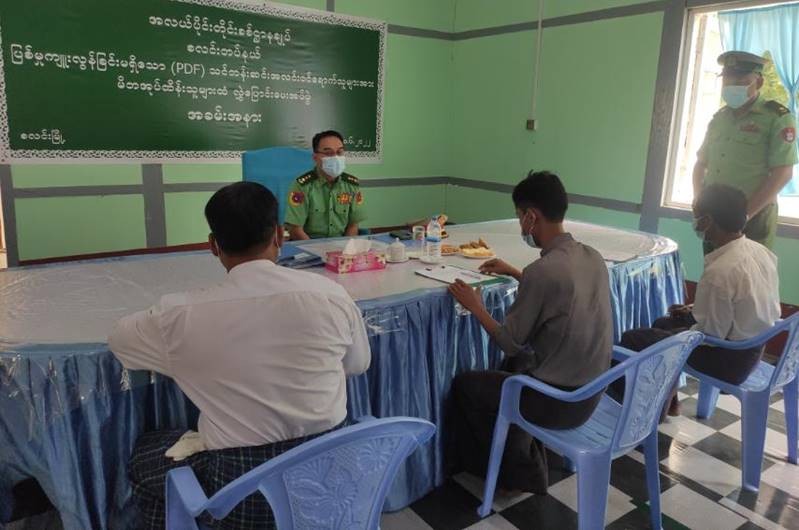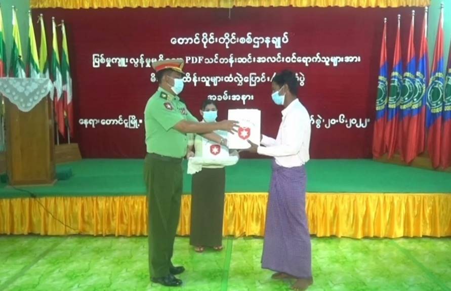တိုင်းရင်းသားလက်နက်ကိုင်အဖွဲ့နယ်မြေအတွင်း သင်တန်းများတက်ရောက်ခဲ့ပြီး ပြစ်မှုကျူးလွန်ခြင်းမရှိဘဲ ဥပဒေဘောင်အတွင်း ပြန်လည်ဝင်ရောက်လာသော PDF အဖွဲ့ဝင်များအား ၎င်းတို့၏ မိဘအုပ်ထိန်းသူများထံသို့ ထပ်မံလွှဲပြောင်းပေးအပ်ခြင်းကို ယနေ့နံနက်ပိုင်းတွင် မကွေးတိုင်းဒေသကြီး၊ စလင်းမြို့နယ်စီမံအုပ်ချုပ်ရေးကောင်စီရုံးနှင့် ပဲခူးတိုင်းဒေသကြီး၊ တောင်ငူမြို့ရှိ ခရိုင်အထွေထွေအုပ်ချုပ်ရေးမှူးရုံးခန်းမတို့၌ ပြုလုပ်ကြရာ သက်ဆိုင်ရာတိုင်းစစ်ဌာနချုပ်များမှ ဒုတိယတိုင်းမှူးနှင့် တာဝန်ရှိသူများ၊ ဥပဒေဘောင်အတွင်း ဝင်ရောက်လာသူများနှင့် ၎င်းတို့၏ မိဘအုပ်ထိန်းသူများ တက်ရောက်ကြသည်။