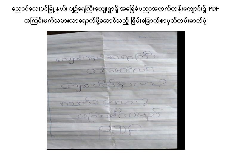 ထိုသို့ဆောင်ရွက်လျက်ရှိရာ ဇွန်လ ၂၀ ရက်နေ့ နံနက် ၈ နာရီ ၃၀ မိနစ်ခန့်တွင် ပဲခူးတိုင်းဒေသကြီး၊ ညောင်လေးပင်မြို့နယ်၊ ပျဉ်ရေကြီးကျေးရွာရှိ အခြေခံပညာ အထက်တန်းကျောင်း၏ ခြံစည်းရိုးအုတ်ခုံပေါ်၌ PDF အမည်ခံ အကြမ်းဖက်သမားများက အနာဂတ်လူငယ်များ၏ ပညာသင်ကြားမှုအား ဟန့်တားသည့် ခြိမ်းခြောက်စာတစ်စောင်ကို ထားရှိသွားကြောင်း သိရှိရသည်။