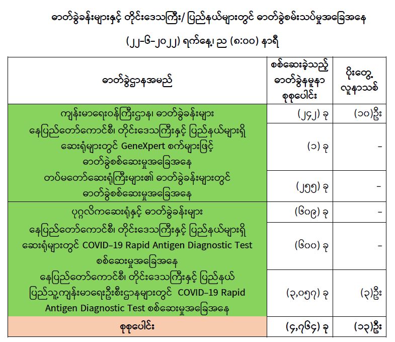 သို့ဖြစ်ပါ၍ ယနေ့အထိ ဓာတ်ခွဲနမူနာစုစုပေါင်း (၈,၃၃၂,၀၃၇)ခုအား စစ်ဆေးခဲ့ပြီး COVID-19 ဓာတ်ခွဲအတည်ပြုလူနာ စုစုပေါင်း (၆၁၃,၅၂၁) ဦး ရှိပြီဖြစ်ပါသည်။