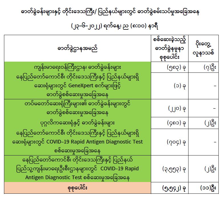 COVID-19 သံသယလူနာများ၊ ဓာတ်ခွဲအတည်ပြုလူနာနှင့် အနီးကပ်ထိတွေ့ခဲ့သူများနှင့် အသွားအလာကန့်သတ်ထားရှိသူများအား COVID-19 ရောဂါ ရှိ၊ မရှိ ဓာတ်ခွဲစမ်းသပ်စစ်ဆေးခြင်းအား ပုံမှန်ဆောင်ရွက်လျက်ရှိပြီး (၂၂-၆-၂၀၂၂) ရက်နေ့၊ ည (၈:၀၀) နာရီမှ (၂၃-၆-၂၀၂၂) ရက်နေ့၊ ည (၈:၀၀) နာရီအတွင်း ဓာတ်ခွဲနမူနာစုစုပေါင်း (၅,၅၄၂) ခုအား စစ်ဆေးပြီးစီးခဲ့ရာ COVID-19 ရောဂါ ဓာတ်ခွဲ အတည်ပြုလူနာသစ် (၁၁) ဦး တွေ့ရှိရပါသည်။ ထို့ကြောင့် ယနေ့အတွက် ရောဂါပိုးတွေ့ရှိမှုရာခိုင်နှုန်းမှာ (၀.၂) ရာခိုင်နှုန်း ရှိပါသည်။