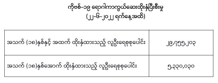 COVID-19 ရောဂါ ကာကွယ်ထိန်းချုပ်ရေးအတွက် တိုင်းဒေသကြီး/ပြည်နယ်များတွင် COVID-19 ရောဂါကာကွယ်ဆေးကို ဦးတည်အုပ်စုများသတ်မှတ်၍ ထိုးနှံပေးလျက်ရှိရာ (၂၂-၆-၂၀၂၂) ရက်နေ့အထိ အသက်(၁၈)နှစ်နှင့်အထက် လူဦးရေစုစုပေါင်း (၂၉,၇၅၅,၂၀၃) ဦးနှင့် အသက် (၁၈)နှစ်အောက် လူဦးရေစုစုပေါင်း (၅,၃၃၀,၀၃၀) ဦး တို့အား ထိုးနှံထားရှိပြီး ဖြစ်ပါသည်။