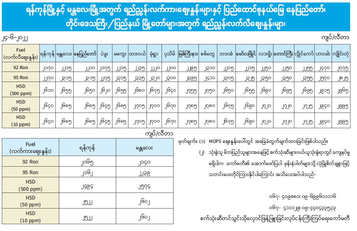 ရန်ကုန်မြို့နှင့် မန္တလေးမြို့အတွက် ရည်ညွှန်းလက်ကားဈေးနှုန်းများနှင့် ပြည်ထောင်စုနယ်မြေ နေပြည်တော်၊ တိုင်းဒေသကြီး/ပြည်နယ် မြို့တော်များအတွက် ရည်ညွှန်းလက်လီဈေးနှုန်းများ 06/24/2022