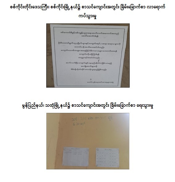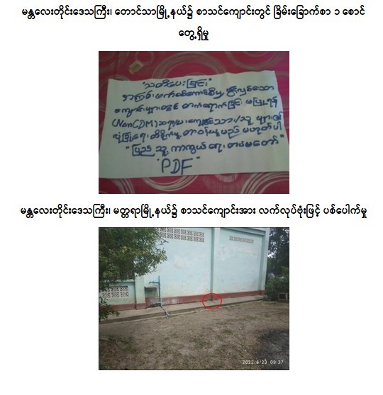 ထိုသို့လုပ်ဆောင်လျက်ရှိရာ ဇွန်လ ၂၃ ရက်နေ့တွင် စစ်ကိုင်းတိုင်းဒေသကြီး၊ စစ်ကိုင်းမြို့နယ်၊ ထုံးဘိုကျေးရွာရှိ အခြေခံပညာအထက်တန်းကျောင်းခွဲ၊ မွန်ပြည်နယ်၊ သထုံမြို့နယ်၊ ရှမ်းစုကျေးရွာရှိ အခြေခံပညာအထက်တန်းကျောင်းခွဲနှင့် မန္တလေးတိုင်းဒေသကြီး၊ တောင်သာမြို့နယ်၊ ကြီးပင်တဲကျေးရွာရှိ အခြေခံပညာအလယ်တန်းကျောင်းတို့၌ ကျောင်းသား၊ ကျောင်းသူများ ပညာရည်သင်ကြားရေးကို အနှောင့်အယှက်ဖြစ်စေရန်ရည်ရွယ်၍ နိုင်ငံရေး အစွန်းရောက် အကြမ်းဖက်သမားများက ခြိမ်းခြောက်စာများ ကပ်သွားကြောင်း သတင်းအရ လုံခြုံရေးတပ်ဖွဲ့ဝင်များက သွားရောက်စစ်ဆေးခဲ့ပြီး ဖယ်ရှားရှင်းလင်းခဲ့ကြောင်း သိရသည်။