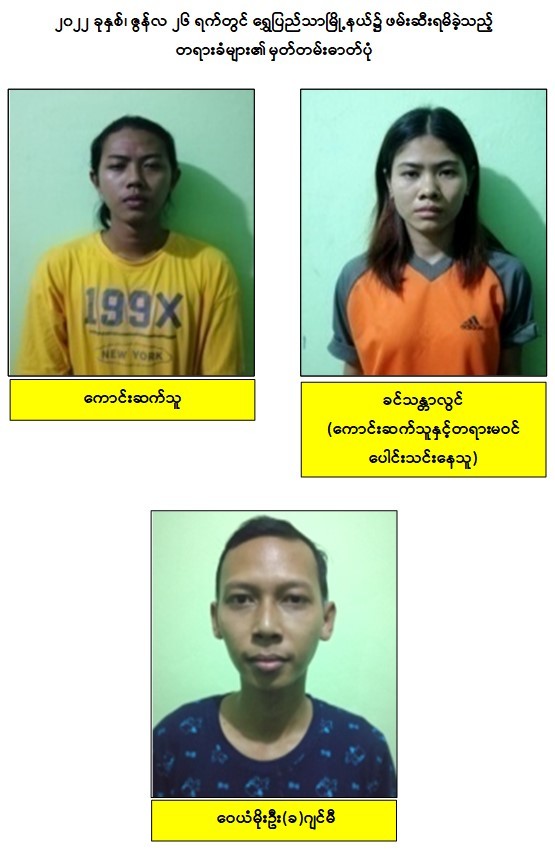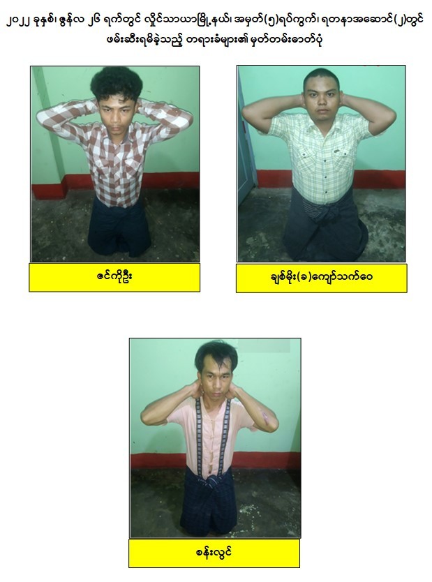သို့ဖြစ်ပါ၍ ဖမ်းဆီးရမိတရားခံများအား ဥပဒေအရ ထိရောက်စွာ အရေးယူနိုင်ရေး ဆက်လက်ဆောင်ရွက်သွားမည်ဖြစ်ပြီး အကြမ်းဖက်မှုဆောင်ရွက်နေသူများအား ပြည်သူတစ်ရပ်လုံးက ဝိုင်းဝန်းကာကွယ်တိုက်ဖျက်ကြရန်နှင့် ပြစ်မှုကျူးလွန်ရာတွင် ပါဝင်ပတ်သက်သူများ၊ နောက်ကွယ်မှ ထောက်ပံ့ပေးလျက်ရှိသော ဆက်စပ်တရားခံများအား အမြန်ဆုံးဖမ်းဆီးရမိရေးအတွက် ၎င်းတို့ ပုန်းခိုရာနေရာများ၊ လှုပ်ရှားသွားလာ နေထိုင်မှု သတင်းများရရှိပါက သက်ဆိုင်ရာသို့ လျှို့ဝှက်စွာ သတင်းပေးတိုင်ကြားနိုင်ပါကြောင်း၊ သတင်းပေးသူနှင့် ဖမ်းဆီးပေးသူများအား ထိုက်တန်စွာ လျှို့ဝှက်၍ဆုငွေများချီးမြှင့် ပေးလျက်ရှိကြောင်းနှင့်မြို့ရွာများ အမြန်ဆုံးအေးချမ်းတည်ငြိမ်ရေးအတွက် ပြည်သူ တစ်ရပ်လုံး ပူးပေါင်းပါဝင်ကြိုးပမ်း ဆောင်ရွက်နိုင်ပါရန် မေတ္တာရပ်ခံအပ်ပါကြောင်း အသိပေး သတင်းထုတ်ပြန် အပ်ပါသည်။