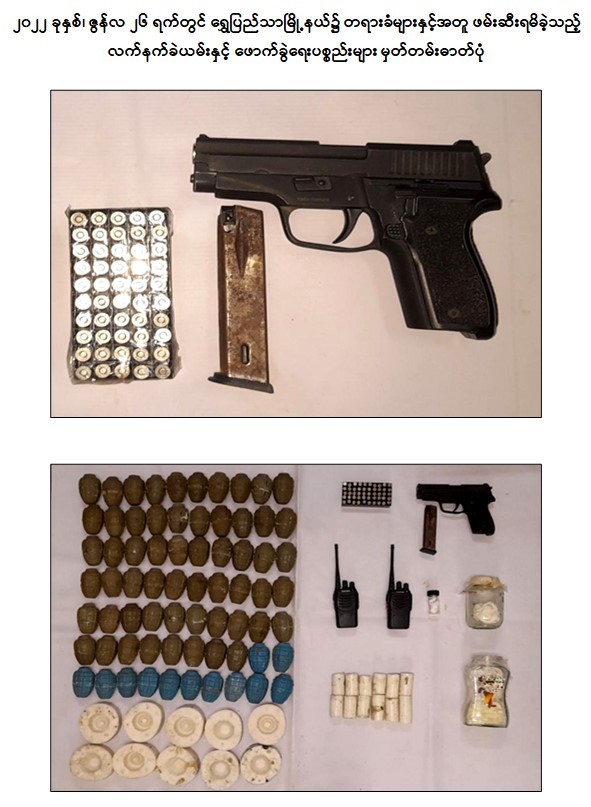 ဖမ်းဆီးရမိတရားခံများ၏ ထွက်ဆိုချက်အရ ဇွန်လ ၂၆ ရက် ညပိုင်းတွင် BFRAF အမည်ခံ အကြမ်းဖက်အဖွဲ့ဝင်များဖြစ်သည့် ရှုမောင်မောင်အောင်၊ ၎င်းနှင့်တရားမဝင် ပေါင်းသင်းနေသူ သင်းရနံ့လှိုင်၊ ထက်လင်းနိုင်၊ ၎င်းနှင့်တရားမဝင်ပေါင်းသင်းနေသူ အေးသီရိမိုး၊ ဝေယံဖြိုး၊ ၎င်းနှင့်တရားမဝင်ပေါင်းသင်းနေသူ ဇွန်ပွင့်ခင်ဦး၊ ကျော်ဇင်သိန်း၊ ၎င်းနှင့်တရားမဝင် ပေါင်းသင်းနေသူ ဖြူဖြူသွယ်၊ ကောင်းဆက်သူ၊ ၎င်းနှင့်တရားမဝင် ပေါင်းသင်းနေသူ ခင်သန္တာလွင်နှင့် ဝေယံမိုးဦး(ခ)ဂျင်မီတို့ ၁၁ ဦးသည် ရွှေပြည်သာမြို့နယ်ရှိ တိုက်ခန်း၌ ပါတီပွဲကျင်းပ၍ မူးယစ်သောက်စားနေစဉ် Sigsauer ပစ္စတို ၁ လက်၊ ၎င်းကျည်အိမ် ၁ ခု၊ ပွိုင့်-၃၈၀ ကျည် ၅၀ တောင့်၊ လက်လုပ်မိုင်း ၇၀ လုံး၊ လမ်းလျှောက်စကားပြောစက် ၂ လုံး၊ ၅ ဂါလံဆံ့အက်ဆစ်ပုံ ၃ ပုံ၊ ၂ ဂါလံဆံ့ အက်ဆစ်ပုံ ၂ လုံး၊ Keypad ဖုန်း ၁ လုံး၊ ဖောက်ခွဲရေးဆက်စပ်ပစ္စည်းများနှင့်အတူ ထပ်မံဖမ်းဆီးရမိခဲ့သည်။