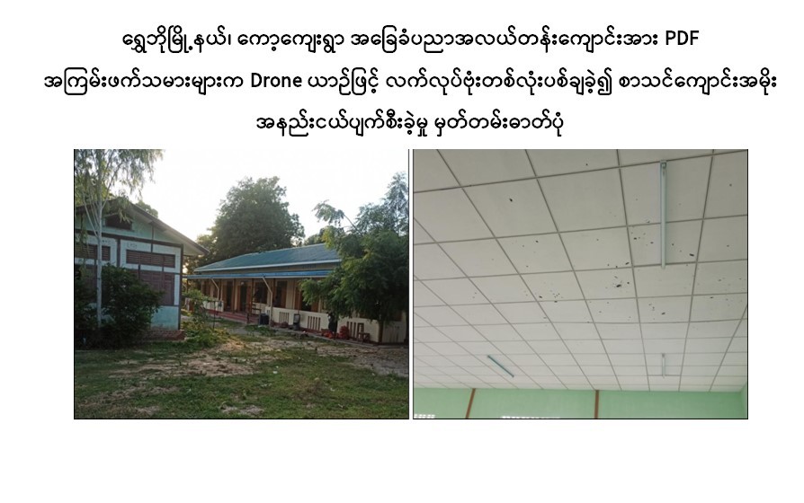 စစ်ကိုင်းတိုင်းဒေသကြီး၊ ရွှေဘိုမြို့နယ်၊ ကော့ကျေးရွာရှိ အခြေခံပညာ အလယ်တန်းကျောင်း၌ လုံခြုံရေးဆောင်ရွက်နေသည့် လုံခြုံရေးတပ်ဖွဲ့ဝင်များအား PDF အကြမ်းဖက်သမားများက Drone ယာဉ်အသုံးပြု၍ လက်လုပ်ဗုံးတစ်လုံး လာရောက်ပစ်ချ ပေါက်ကွဲခဲ့သဖြင့် စာသင်ကျောင်းအမိုးအနည်းငယ်ပျက်စီးခဲ့ကြောင်း သိရသည်။