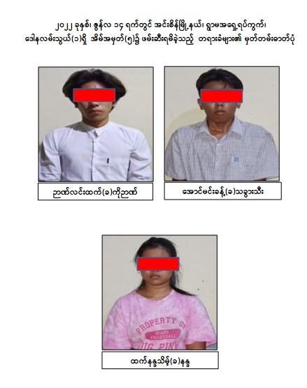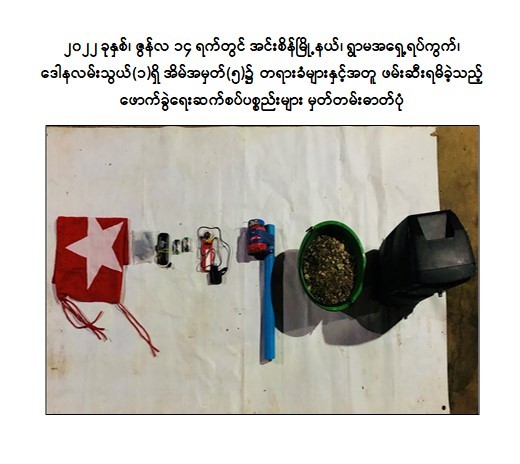 ဖြစ်စဉ်တွင် တရားခံ ကျား ၆ ဦး၊ မ ၄ ဦး၊ ပေါင်း ၁၀ ဦးတို့အား လက်လုပ် Remote မိုင်း ၂ လုံး၊ Sound Box အတွင်း ထည့်သွင်းတပ်ဆင်ထားသည့် Remote မိုင်း ၁ လုံး၊ Keypad ဖုန်း ၁ လုံး၊ ကြယ်ဖြူတစ်လုံးပါ အလံ ၁ ခုတို့နှင့်အတူ ဖမ်းဆီးရမိခဲ့သည်။