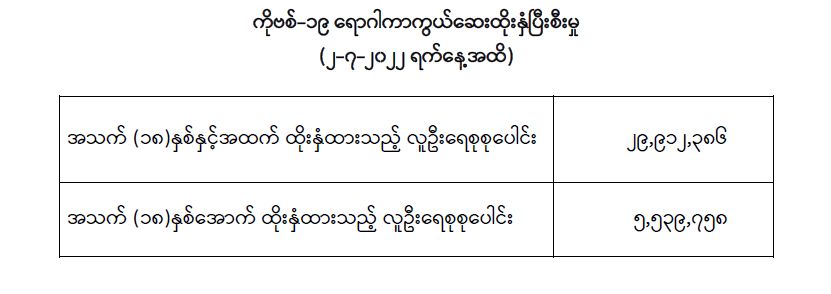 COVID-19 ရောဂါ ကာကွယ်ထိန်းချုပ်ရေးအတွက် တိုင်းဒေသကြီး/ ပြည်နယ်များတွင် COVID-19 ရောဂါကာကွယ်ဆေးကို ဦးတည်အုပ်စုများသတ်မှတ်၍ ထိုးနှံပေးလျက်ရှိရာ (၂-၇-၂၀၂၂) ရက်နေ့အထိ အသက် (၁၈) နှစ်နှင့်အထက် လူဦးရေစုစုပေါင်း (၂၉,၉၁၂,၃၈၆) ဦး နှင့် အသက် (၁၈) နှစ်အောက် လူဦးရေစုစုပေါင်း (၅,၅၃၉,၇၅၈) ဦးတို့အား ထိုးနှံထားရှိပြီး ဖြစ်ပါသည်။