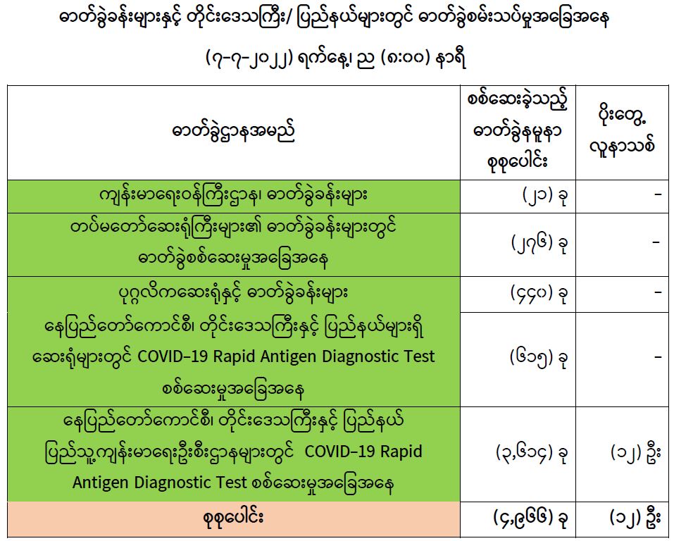 သို့ဖြစ်ပါ၍ ယနေ့အထိ ဓာတ်ခွဲနမူနာစုစုပေါင်း (၈,၄၀၆,၆၁၀)ခုအား စစ်ဆေးခဲ့ပြီး COVID-19 ဓာတ်ခွဲအတည်ပြုလူနာ စုစုပေါင်း (၆၁၃,၆၉၅) ဦး ရှိပြီ ဖြစ်ပါသည်။