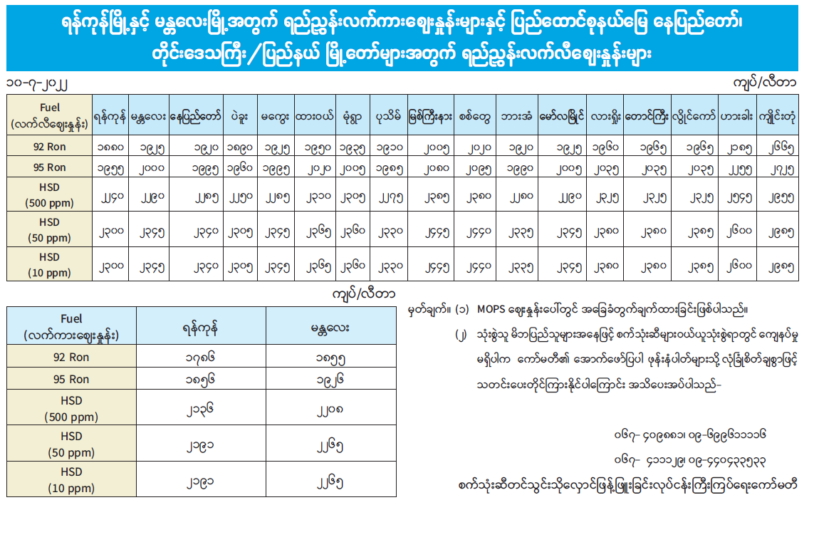 ရန်ကုန်မြို့နှင့် မန္တလေးမြို့အတွက် ရည်ညွှန်းလက်ကားဈေးနှုန်းများနှင့် ပြည်ထောင်စုနယ်မြေ နေပြည်တော်၊ တိုင်းဒေသကြီး/ပြည်နယ် မြို့တော်များအတွက် ရည်ညွှန်းလက်လီဈေးနှုန်းများ 07/10/2022