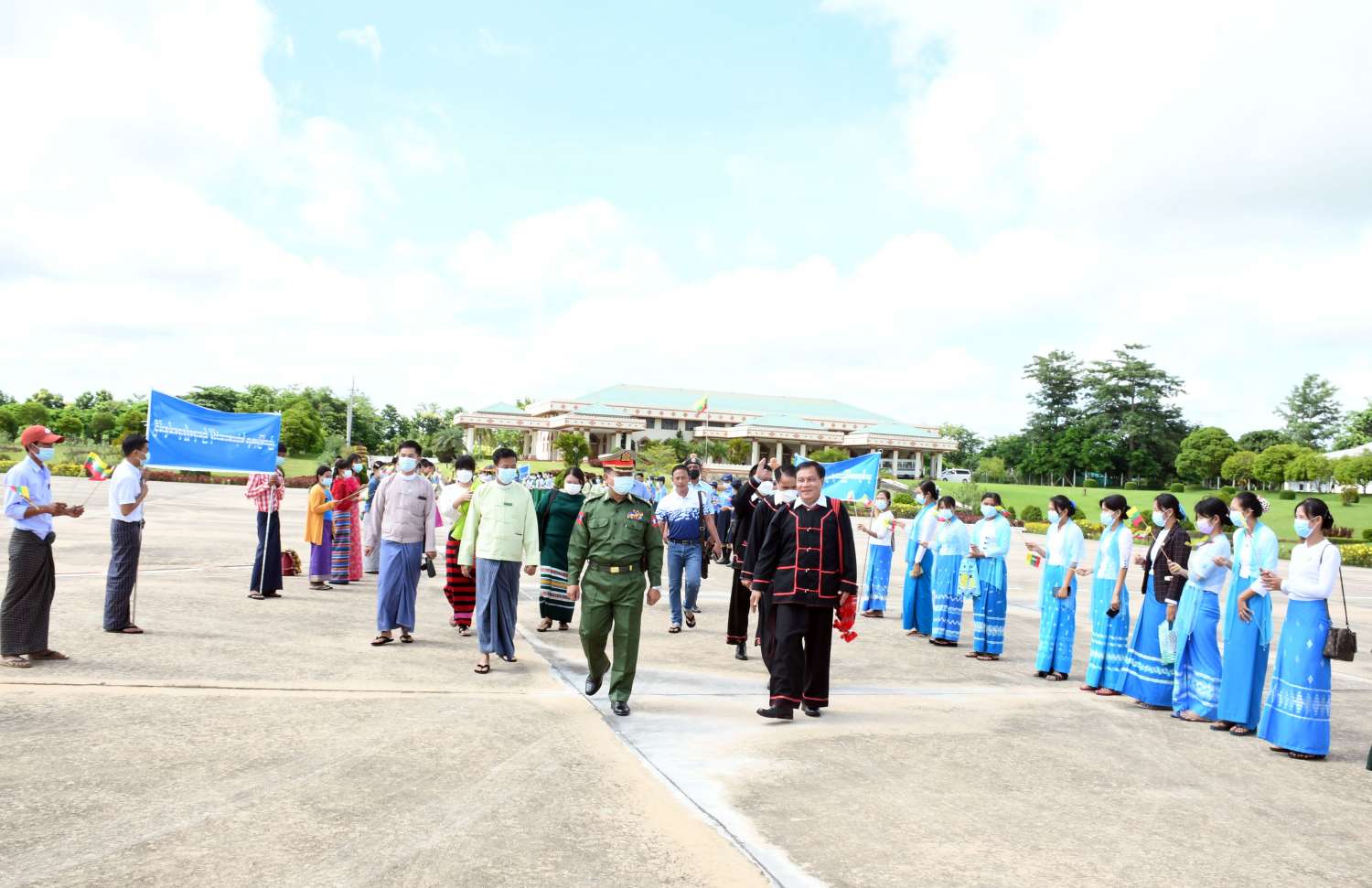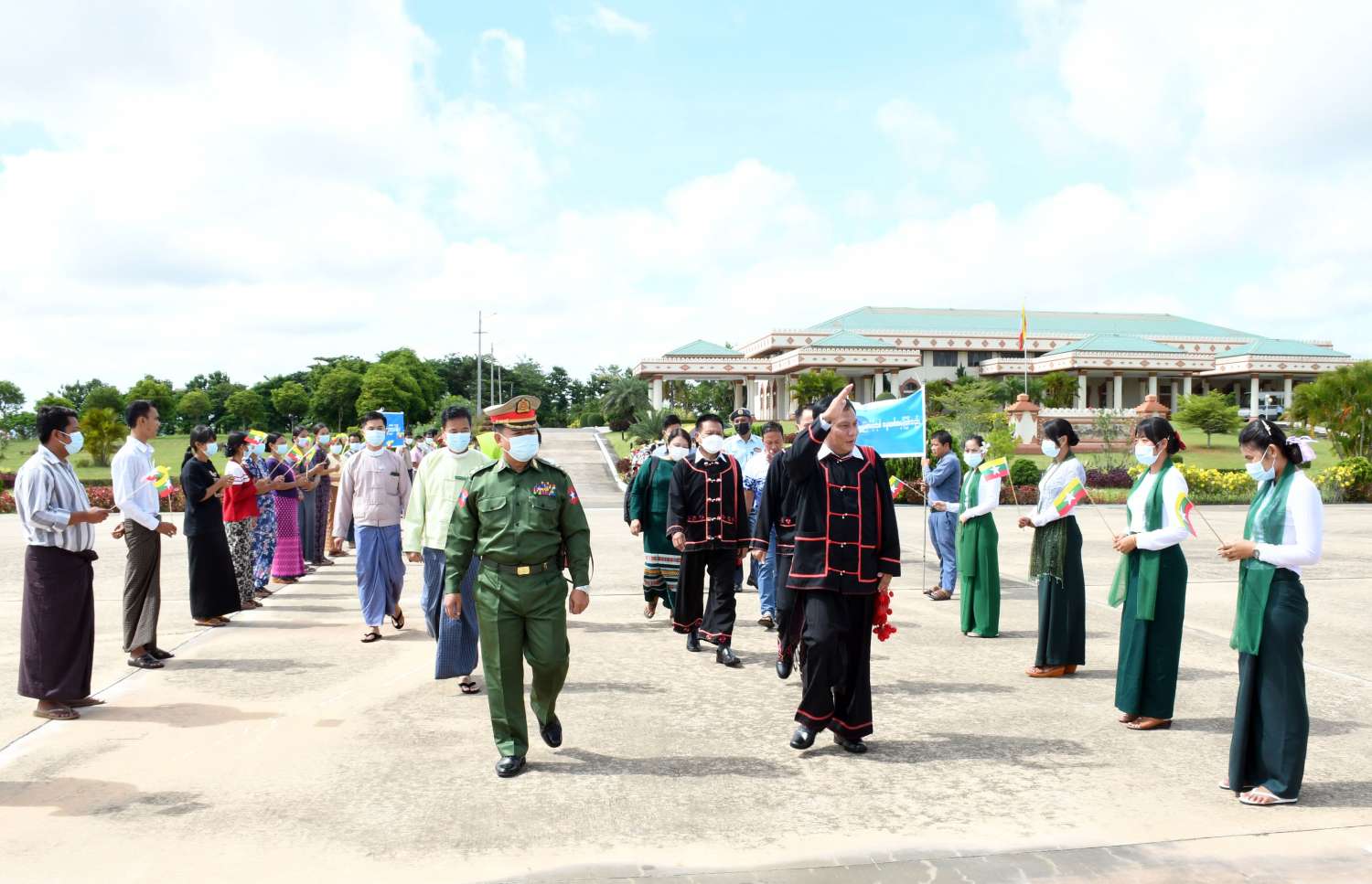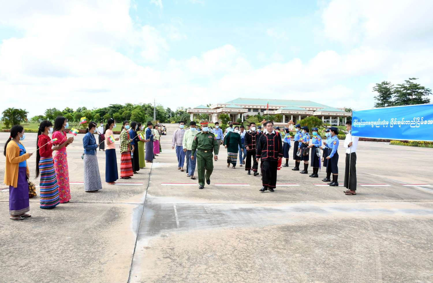 အဆိုပါ လားဟူဒီမိုကရက်တစ်အစည်းအရုံး (LDU) အထွေထွေအတွင်းရေးမှူး ဦးဆောင်သည့် ငြိမ်းချမ်းရေးကိုယ်စားလှယ်အဖွဲ့အား အမျိုးသားစည်းလုံးညီညွတ်ရေးနှင့် ငြိမ်းချမ်းရေးဖော်ဆောင်မှု ညှိနှိုင်းရေးကော်မတီ အဖွဲ့ဝင်များနှင့် တာဝန်ရှိသူများ၊ သာသနာရေးနှင့်ယဉ်ကျေးမှုဝန်ကြီးဌာန၊ အနုပညာဦးစီးဌာနမှ တိုင်းရင်းသားတိုင်းရင်းသူများ၊ ဌာနဆိုင်ရာဝန်ထမ်းများ၊ ငြိမ်းချမ်းရေးကို လိုလားသည့် ဒေသခံပြည်သူများက ထာဝရငြိမ်းချမ်းရေးကို ရရှိရေးသည် ပြည်သူတစ်ရပ်လုံး၏ ဆန္ဒအစစ်အမှန် ဖြစ်သည်၊ ငြိမ်းချမ်းရေးရရှိရေးသည် နိုင်ငံသားအားလုံး၏ ဆန္ဒအမှန်ဖြစ်သည်၊ ပြည်ထောင်စုကြီး ငြိမ်းချမ်းဖို့တွေ့ဆုံ ဆွေးနွေးကြပါစို့၊ တိုင်းရင်းသားတွေစည်းလုံးမှ ငြိမ်းချမ်းတည်ငြိမ် အေးချမ်းရစသည့် စာသားပါ ဆိုင်းဘုတ်များကိုင်ဆောင်၍ လည်းကောင်း၊ နိုင်ငံတော်အလံငယ်များ ကိုင်ဆောင်၍လည်းကောင်း နေပြည်တော်လေဆိပ်၌ ပို့ဆောင်နှုတ်ဆက်ကြသည်။