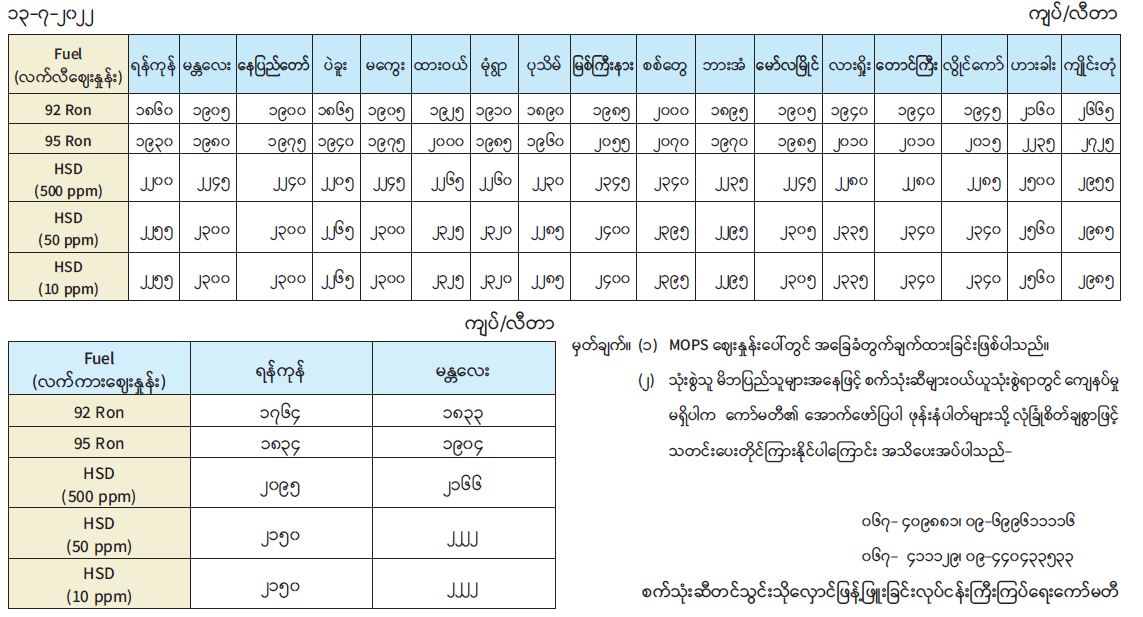 ရန်ကုန်မြို့နှင့် မန္တလေးမြို့အတွက် ရည်ညွှန်းလက်ကားဈေးနှုန်းများနှင့် ပြည်ထောင်စုနယ်မြေ နေပြည်တော်၊ တိုင်းဒေသကြီး/ပြည်နယ် မြို့တော်များအတွက် ရည်ညွှန်းလက်လီဈေးနှုန်းများ 07/13/2022