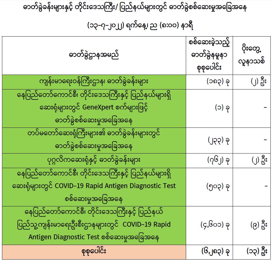 သို့ဖြစ်ပါ၍ ယနေ့အထိ ဓာတ်ခွဲနမူနာစုစုပေါင်း (၈,၄၃၇,၁၉၈) ခုအားစစ်ဆေးခဲ့ပြီး COVID-19 ဓာတ်ခွဲအတည်ပြုလူနာစုစုပေါင်း (၆၁၃,၇၇၃) ဦး ရှိပြီ ဖြစ်ပါသည်။