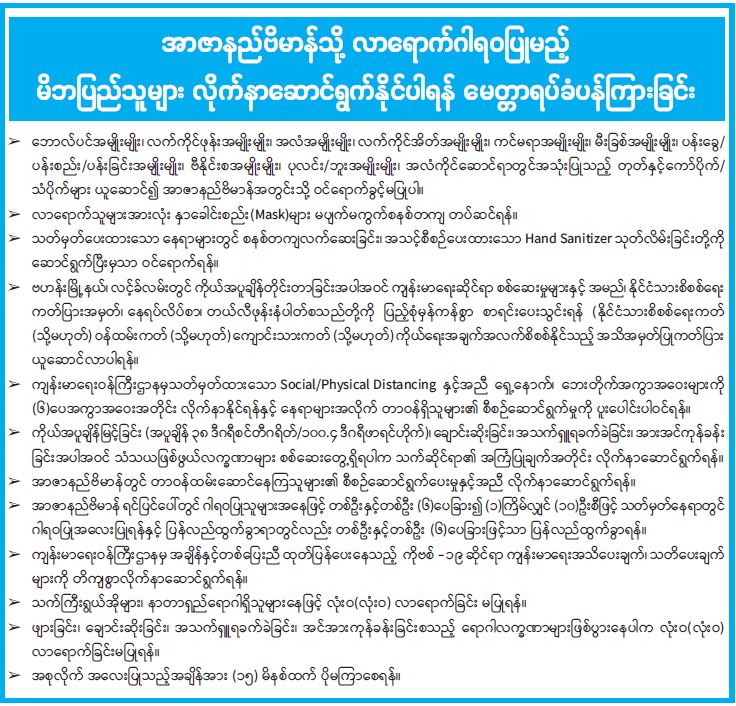 အာဇာနည်ဗိမာန်သို့ လာရောက်ဂါရဝပြုမည့် မိဘပြည်သူများ လိုက်နာဆောင်ရွက်နိုင်ပါရန် မေတ္တာရပ်ခံပန်ကြားခြင်း 07/14/2022 အာဇာနည်ဗိမာန်သို့ လာရောက်ဂါရဝပြုမည့် မိဘပြည်သူများ လိုက်နာဆောင်ရွက်နိုင်ပါရန် မေတ္တာရပ်ခံပန်ကြားခြင်း
