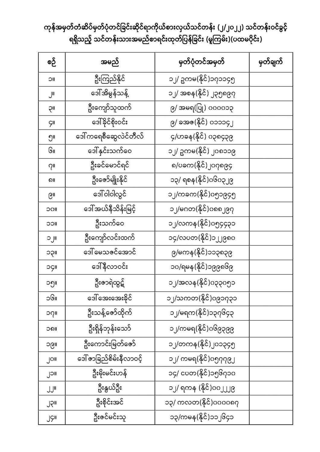 ကုန်အမှတ်တံဆိပ်မှတ်ပုံတင်ခြင်းဆိုင်ရာကိုယ်စားလှယ်သင်တန်း (၂/၂၀၂၂) သင်တန်းဝင်ခွင့် ရရှိသည့် သင်တန်းသားအမည်စာရင်းထုတ်ပြန်ခြင်း (မူကြမ်း)(ပထမပိုင်း) 07/15/2022 ကုန်အမှတ်တံဆိပ်မှတ်ပုံတင်ခြင်းဆိုင်ရာကိုယ်စားလှယ်သင်တန်း (၂/၂၀၂၂) သင်တန်းဝင်ခွင့် ရရှိသည့် သင်တန်းသားအမည်စာရင်းထုတ်ပြန်ခြင်း (မူကြမ်း)(ပထမပိုင်း)