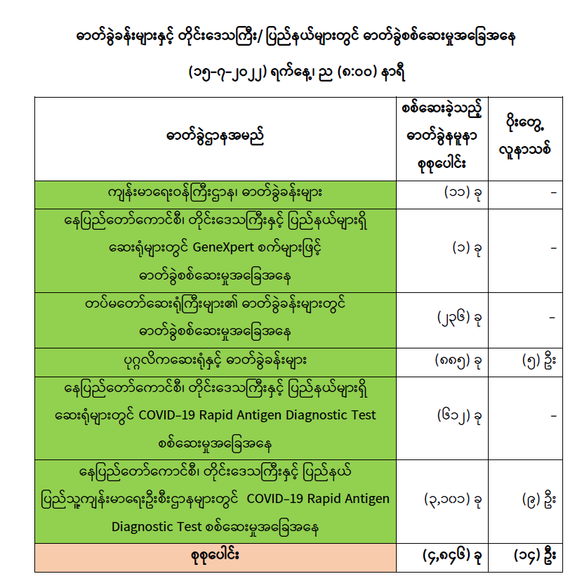 သို့ဖြစ်ပါ၍ ယနေ့အထိ ဓာတ်ခွဲနမူနာစုစုပေါင်း (၈,၄၄၇,၂၅၁) ခုအားစစ်ဆေးခဲ့ပြီး COVID-19 ဓာတ်ခွဲအတည်ပြုလူနာ စုစုပေါင်း (၆၁၃,၇၉၈) ဦး ရှိပြီ ဖြစ်ပါသည်။