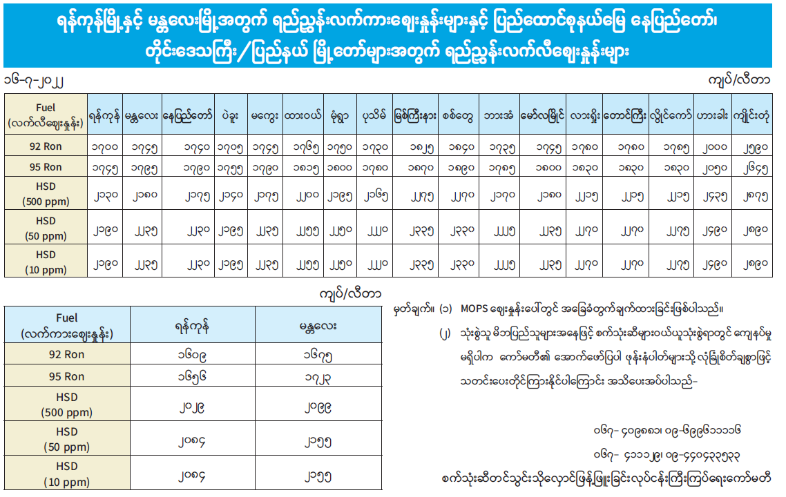 ရန်ကုန်မြို့နှင့် မန္တလေးမြို့အတွက် ရည်ညွှန်းလက်ကား ဈေးနှုန်းများနှင့် ပြည်ထောင်စုနယ်မြေ၊ နေပြည်တော်၊ တိုင်းဒေသကြီး/ ပြည်နယ်မြို့တော်များအတွက် ရည်ညွှန်းလက်လီဈေးနှုန်းများ 07/16/2022