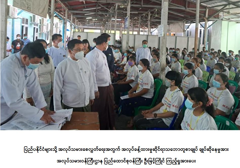 အလုပ်သမားဝန်ကြီးဌာနအနေဖြင့် မတ် ၂၅ ရက်မှ ဇွန် ၃၀ ရက်အထိ ပြည်ပနိုင်ငံများသို့ သွားရောက်အလုပ်လုပ်ကိုင်မည့် အလုပ်သမား စုစုပေါင်း ၃၉၉,၃၉ ဦးကို အလုပ်ခန့်ထားမှုဆိုင်ရာ သဘောတူစာချုပ် ချုပ်ဆိုပေးနိုင်ခဲ့ပြီး ၂၀၂၁ခုနှစ် ဖေဖော်ဝါရီ ၁ ရက်မှ ယခုနှစ် ဇွန် ၃၀ ရက်အထိ ပြည်ပအလုပ်အကိုင် အကျိုးဆောင်လိုင်စင်ရ အေဂျင်စီ အစီအစဉ်ဖြင့်လည်းကောင်း၊ မိမိအစီအစဉ်ဖြင့်လည်းကောင်း၊ ခွင့်ပြန်/ PR ဖြင့်လည်းကောင်း ထိုင်းနိုင်ငံသို့ ၁၁,၁၂၃ ဦး၊ စင်ကာပူနိုင်ငံသို့ ၁၀,၅၆၁ ဦး၊ ကိုရီးယားနိုင်ငံသို့ ၂,၀၈၃ ဦး၊ ဂျပန်နိုင်ငံသို့ ၇,၅၅၈ ဦး၊ မလေးရှားနိုင်ငံသို့ ၃,၂၈၆ ဦးအပါအဝင် ပြည်ပနိုင်ငံ ၅၇ နိုင်ငံသို့ သွားရောက်အလုပ်လုပ်ကိုင်မည့် အလုပ်သမား ၃၆,၃၆၅ ဦးကို ပြည်ပအလုပ်အကိုင် အလုပ်သမား သက်သေခံကတ် (OWIC) ပြုလုပ်ပေးပြီး စေလွှတ်ခွင့်ပြုပေးခဲ့သည်။