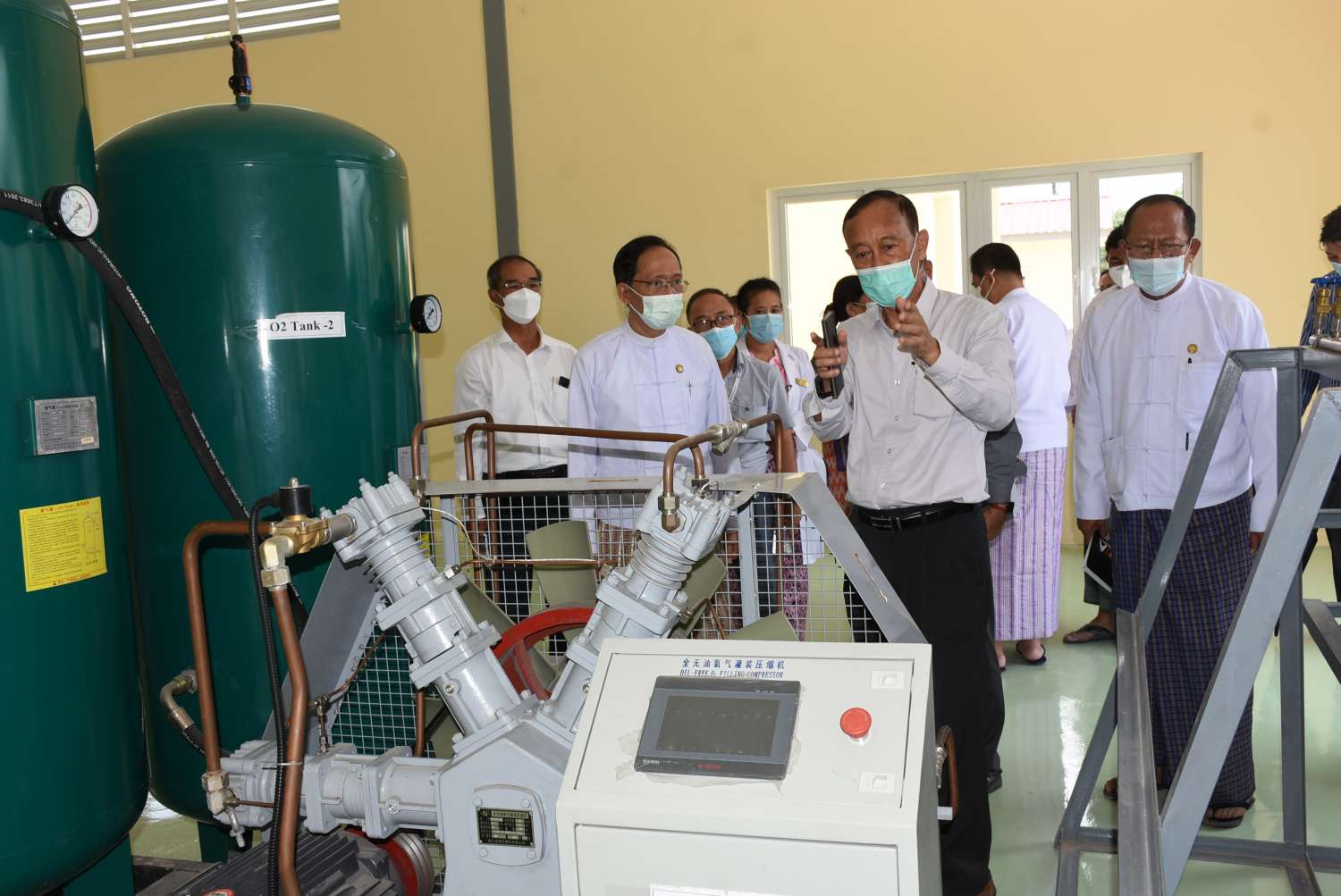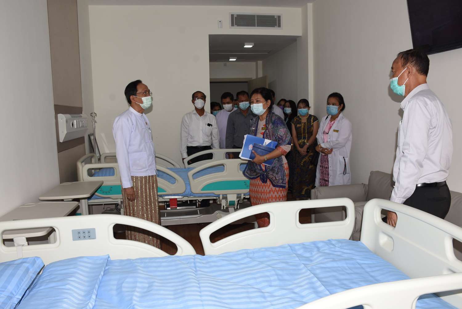 ထို့နောက် ပြည်ထောင်စုဝန်ကြီးနှင့်အဖွဲ့သည် Negative Pressure ဖြင့် လူနာများထားရှိနိုင်မည့် သီးသန့်ခန်း(Isolation room) များ၊ အထူးခန်းများ၊ အထူးကြပ်မတ်ကုသဌာနများ (Intensive Care Unit and High Dependency Unit)များ၊ အဆောက်အဦတွင် တပ်ဆင်ထားသည့် Wifi စနစ်၊ လူနာများအတွက် ရုပ်မြင်သံကြားလိုင်းများ ကြည့်ရှုနိုင်မည့်စနစ်၊ လူနာခန်းများနှင့် ဆရာဝန်ခန်းများ ဆက်သွယ်နိုင်ရန်အတွက် အင်တာကွန်းစနစ် တပ်ဆင်နေမှု အခြေအနေ၊ Solar ဖြင့် မီးပေးစနစ်နှင့် Transformer တို့ကို ကြည့်ရှု၍ ဝေဘာဂီအထူးကုဆေးရုံကြီးရှိ အောက်ဆီဂျင်စက်ရုံ (Oxygen plant)နှင့် ရေသန့်စင်စက် (Water treatment system)၊ လူနာများစိတ်ချမ်းသာစွာအနားယူနိုင်ရေးအတွက် မြေယာရှုခင်း(landscaping) ပြုပြင်နေမှုအခြေအနေတို့ကို လှည့်လည်ကြည့်ရှု၍ လိုအပ်သည်များ မှာကြားဖြည့်ဆည်းပေးခဲ့ သည်။