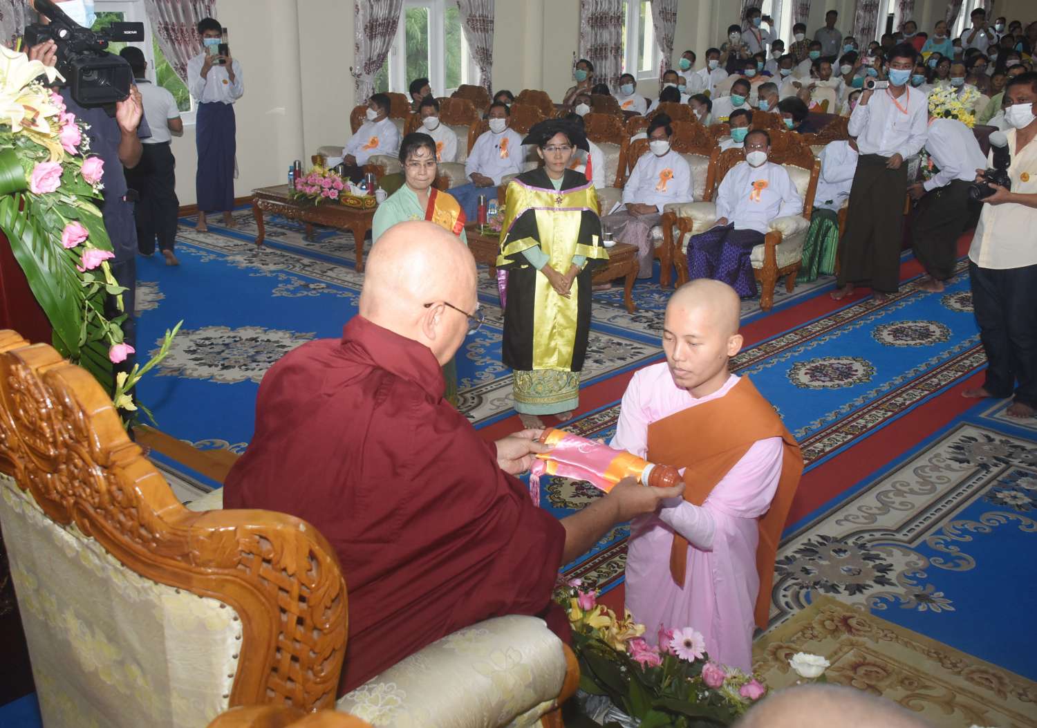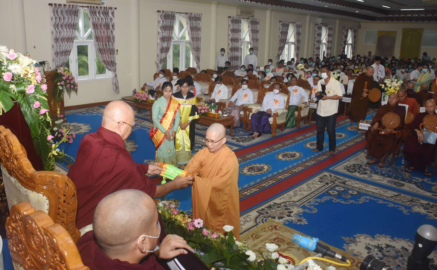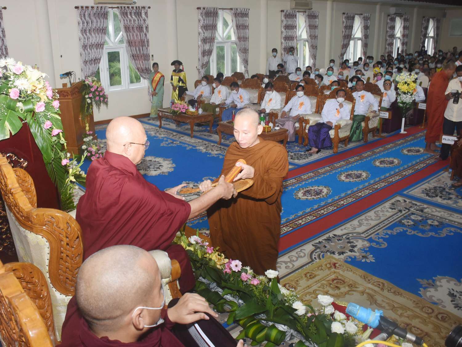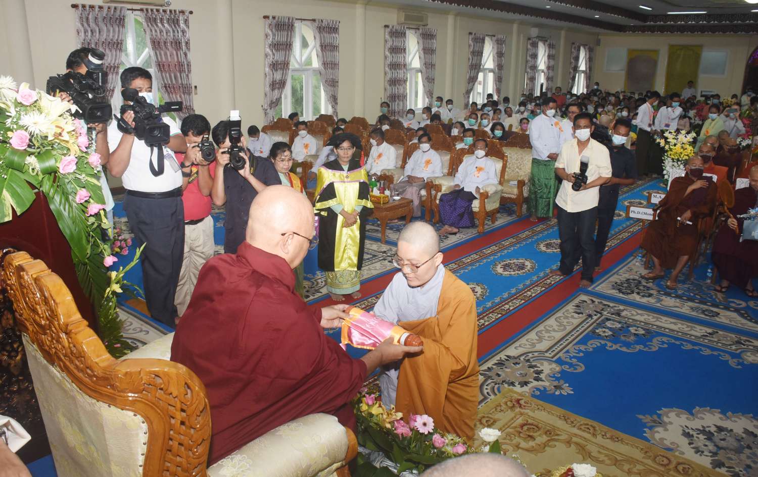 အခမ်းအနားသို့ နိုင်ငံတော်သံဃမဟာနာယကအဖွဲ့ ဒုတိယဥက္ကဋ္ဌများဖြစ်ကြသော အဂ္ဂမဟာပဏ္ဍိတ ဘဒ္ဒန္တဇောတိပါလ၊ အဂ္ဂမဟာပဏ္ဍိတ ဘဒ္ဒန္တကောဝိဒ၊ နိုင်ငံတော်သံဃမဟာ နာယကအဖွဲ့ တွဲဖက်အကျိုးတော်ဆောင်ဆရာတော် အဂ္ဂမဟာသဒ္ဓမ္မဇောတိကဓဇ ဘဒ္ဒန္တ ပညာဓဇ၊ တိပိဋကဓရ ဓမ္မဘဏ္ဍာ ဂါရိက၊ တိပိဋကကောဝိဒ အဂ္ဂမဟာပဏ္ဍိတ ဘဒ္ဒန္တသိရိန္ဒာဘိဝံသနှင့် အပြည်ပြည်ဆိုင်ရာ ထေရဝါဒဗုဒ္ဓသာသနာပြုတက္ကသိုလ်၊ ပါမောက္ခချုပ်ဆရာတော် အဂ္ဂမဟာပဏ္ဍိတ၊ မဟာဓမ္မကထိကဗဟုဇနဟိတဓရ ဒေါက်တာ ဘဒ္ဒန္တ ဆေကိန္ဒ မထေရ်မြတ် အမှူးပြုသော သင်ကြားဆရာတော်ကြီးများ၊ သင်ကြားသီလရှင် ဆရာကြီးများ ကြွရောက်တော်မူကြပြီး သာသနာရေးနှင့်ယဉ်ကျေးမှုဝန်ကြီးဌာန ပြည်ထောင်စုဝန်ကြီး ဦးကိုကို၊ ရန်ကုန်တိုင်းဒေသကြီးအစိုးရအဖွဲ့ဝန်ကြီးချုပ် ဦးစိုးသိန်း၊ ရန်ကုန်တိုင်းစစ်ဌာနချုပ်တိုင်းမှူး ဗိုလ်ချုပ်ညွန့်ဝင်းဆွေ၊ သာသနာရေးနှင့်ယဉ်ကျေးမှုဝန်ကြီးဌာန ဒုတိယဝန်ကြီး ဦးအေးထွန်း၊ ရန်ကုန်မြို့ တော်စည်ပင်သာယာရေးကော်မတီဥက္ကဋ္ဌ မြို့တော်ဝန် ဦးဗိုလ်ဌေးနှင့် ရန်ကုန်တိုင်းဒေသကြီးအစိုးရအဖွဲ့ဝင်ဝန်ကြီးများ၊ ဌာနဆိုင်ရာအကြီးအကဲများ၊ ဘွဲ့ရပြည်ပနိုင်ငံများမှ သက်ဆိုင်ရာ သံအမတ်ကြီးများ၊ အတွင်းဝန်များနှင့် သံရုံးတာဝန်ခံများ၊ ပြည်တွင်း၊ ပြည်ပနိုင်ငံအသီးသီးမှ ဘွဲ့ရသင်တန်းသားများ ကြွရောက်တော်မူကြသည်။