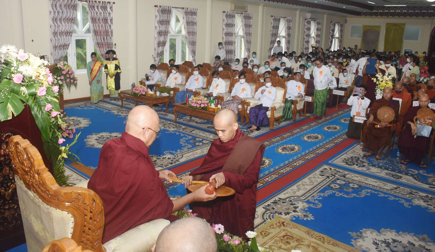 ဆက်လက်၍ ပညာရည်ချွန် ထူးချွန်ဆုအဖြစ် ပါမောက္ခချုပ်ဆရာတော်က ချီးမြှင့်တော်မူသည့် တစ်ကျပ်သား ရွှေစင်ရွှေပြား (Gold Medals) များကို သက်ဆိုင်ရာ ပညာသင်နှစ်အလိုက် ဆွတ်ခူးရရှိကြသည့် ထူးချွန်ရွှေတံဆိပ်ဆုရှင် (Gold Medalist) များဖြစ်ကြသည့် ဗီယက်နမ်နိုင်ငံသူ (သီလရှင်) Mai Thi Huyen နှင့် သြစတေးလျနိုင်ငံသူ Ms. Myat Thet တို့ကို ပြည်ထောင်စုဝန်ကြီး ဦးကိုကို က ပေးအပ်ချီးမြှင့်သည်။ ထို့နောက် ပါမောက္ခချုပ်ဆရာတော်က "ဘွဲ့မှတ်တမ်းမော်ကွန်း စာအုပ်" တွင် လက်မှတ်ရေးထိုးတော်မူပြီး ဘွဲ့ရကျောင်းသားများသို့ သြဝါဒကထာ မြွက်ကြားချီးမြှင့်တော်မူသည်။