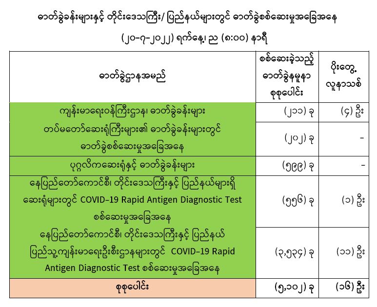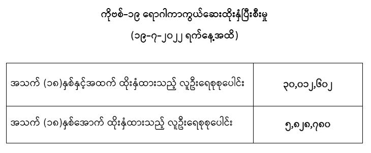 COVID-19 ရောဂါ ကာကွယ်ထိန်းချုပ်ရေးအတွက် တိုင်းဒေသကြီး/ပြည်နယ်များတွင် COVID-19 ရောဂါကာကွယ်ဆေးကို ဦးတည်အုပ်စုများသတ်မှတ်၍ ထိုးနှံပေးလျက်ရှိရာ (၁၉-၇-၂၀၂၂) ရက်နေ့ အထိ အသက် (၁၈) နှစ်နှင့်အထက် လူဦးရေစုစုပေါင်း (၃၀,၀၁၂,၆၀၂) ဦးနှင့် အသက် (၁၈) နှစ်အောက် လူဦးရေစုစုပေါင်း (၅,၈၂၈,၇၈၀) ဦးတို့အား ထိုးနှံထားရှိပြီး ဖြစ်ပါသည်။