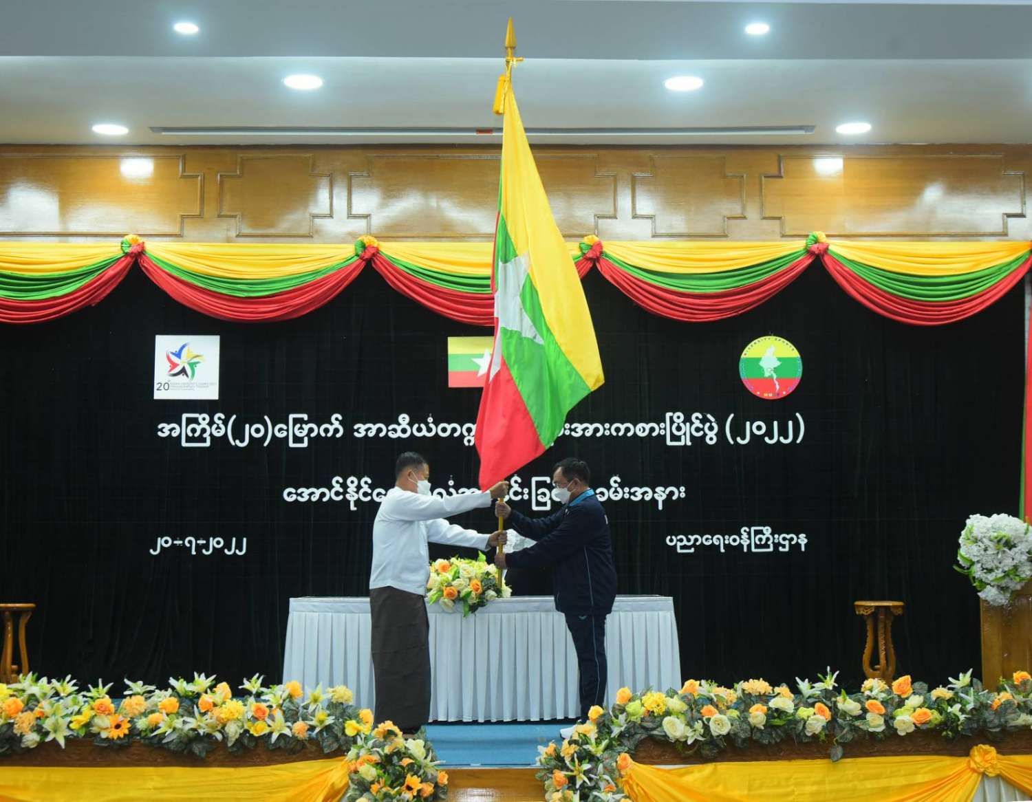 ထို့နောက် နိုင်ငံတော်စီမံအုပ်ချုပ်ရေးဒုတိယဥက္ကဋ္ဌ ဒုတိယဝန်ကြီးချုပ် ဒုတိယဗိုလ်ချုပ်မှူးကြီး စိုးဝင်းက မြန်မာတက္ကသိုလ်အားကစားအဖွဲ့ခေါင်းဆောင် ရန်ကုန်တက္ကသိုလ်ပါမောက္ခချုပ် ဒေါက်တာတင်မောင်ထွန်းထံ ပြည်ထောင်စုသမ္မတ မြန်မာနိုင်ငံတော်အလံကို အပ်နှင်းသည်။