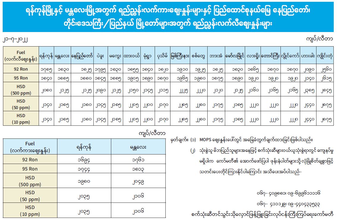 ရန်ကုန်မြို့နှင့် မန္တလေးမြို့အတွက် ရည်ညွှန်းလက်ကားဈေးနှုန်းများနှင့် ပြည်ထောင်စုနယ်မြေ နေပြည်တော်၊ တိုင်းဒေသကြီး/ပြည်နယ် မြို့တော်များအတွက် ရည်ညွှန်းလက်လီဈေးနှုန်းများ 07/21/2022
