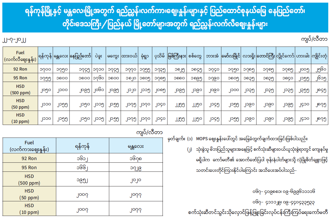 ရန်ကုန်မြို့နှင့် မန္တလေးမြို့အတွက် ရည်ညွှန်းလက်ကားဈေးနှုန်းများနှင့် ပြည်ထောင်စုနယ်မြေ၊ နေပြည်တော်၊ တိုင်းဒေသကြီး/ ပြည်နယ်မြို့တော်များအတွက် ရည်ညွှန်းလက်လီဈေးနှုန်းများ 07/22/2022