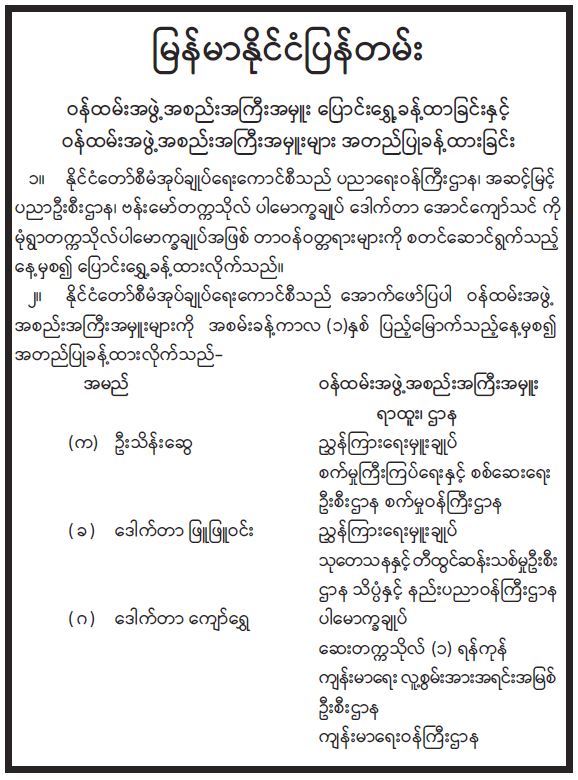 ဝန်ထမ်းအဖွဲ့အစည်းအကြီးအမှူး ပြောင်းရွှေ့ခန့်ထားခြင်းနှင့် ဝန်ထမ်းအဖွဲ့အစည်းအကြီးအမှူးများ အတည်ပြုခန့်ထားခြင်း 07/23/2022 ဝန်ထမ်းအဖွဲ့အစည်းအကြီးအမှူး ပြောင်းရွှေ့ခန့်ထားခြင်းနှင့် ဝန်ထမ်းအဖွဲ့အစည်းအကြီးအမှူးများ အတည်ပြုခန့်ထားခြင်း