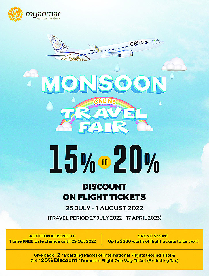 မြန်မာအမျိုးသားလေကြောင်းကို စဉ်ဆက်မပြတ်အားပေးကြသော ခရီးသည်များအတွက် ပြည်တွင်း ပြည်ပ ခရီးစဉ်တွေကို ၁၅ ရာခိုင် နှုန်း- ၂၀ ရာခိုင်နှုန်း Discount ဖြင့် ဝယ်ယူနိုင်မည့် Monsoon Online Travel Fair 2022 ကို ဇူလိုင် ၂၅ ရက်မှ ဩဂုတ် ၁ ရက် အထိ ကျင်းပသွားမည်ဖြစ်သည်။