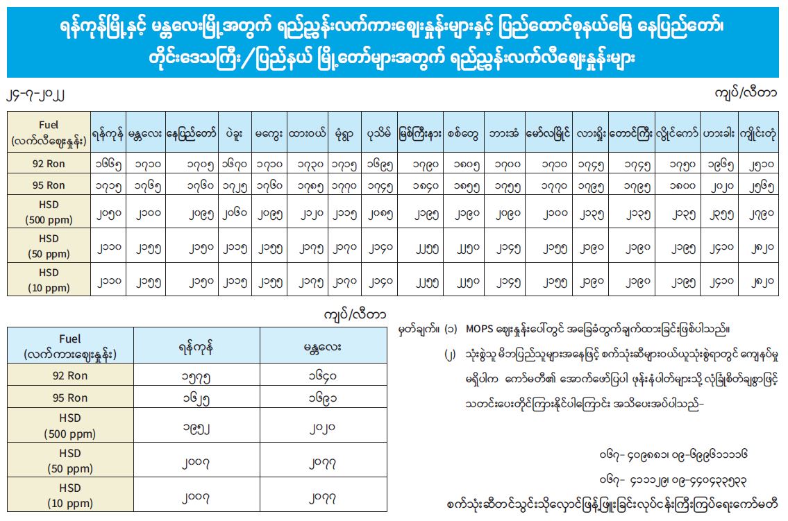 ရန်ကုန်မြို့နှင့် မန္တလေးမြို့အတွက် ရည်ညွှန်းလက်ကားဈေးနှုန်းများနှင့် ပြည်ထောင်စုနယ်မြေ နေပြည်တော်၊ တိုင်းဒေသကြီး/ပြည်နယ် မြို့တော်များအတွက် ရည်ညွှန်းလက်လီဈေးနှုန်းများ 07/24/2022