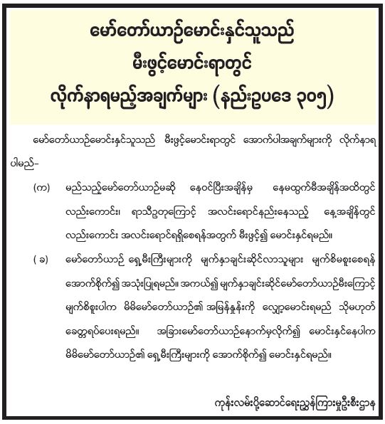 မော်တော်ယာဉ်မောင်းနှင်သူသည် မီးဖွင့်မောင်းရာတွင် လိုက်နာရမည့်အချက်များ (နည်းဥပဒေ ၃၀၅)