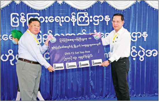 ဆက်လက်၍ ပြည်ထောင်စုဝန်ကြီး ဦးမောင်မောင်အုန်းက မြန်မာ့အသံနှင့်ရုပ်မြင်သံကြားက ထုတ်လွှင့်ပေးလျက်ရှိသည့် အစီအစဉ်များကို ရှမ်းပြည်နယ်အတွင်းရှိ ပြည်သူများဖမ်းယူကြည့်ရှုနိုင်ရန်အတွက် MRTV DVB – T2 Set Top Box အလုံးရေ ၅၀၀ နှင့် အရှေ့ပိုင်းတိုင်းစစ်ဌာနချုပ် တပ်နယ်မိသားစုများအတွက် အလုံးရေ ၅၀၀ ကို ပေးအပ်ရာ ပြည်နယ်ဝန်ကြီးချုပ်နှင့် အရှေ့ပိုင်းတိုင်းစစ်ဌာနချုပ် တိုင်းမှူးတို့က လက်ခံရယူသည်။