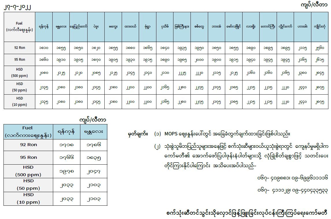 ရန်ကုန်မြို့နှင့် မန္တလေးမြို့အတွက် ရည်ညွှန်းလက်ကားဈေးနှုန်းများနှင့် ပြည်ထောင်စုနယ်မြေ၊ နေပြည်တော်၊ တိုင်းဒေသကြီး/ပြည်နယ်မြို့တော်များအတွက် ရည်ညွှန်းလက်လီဈေးနှုန်းများ