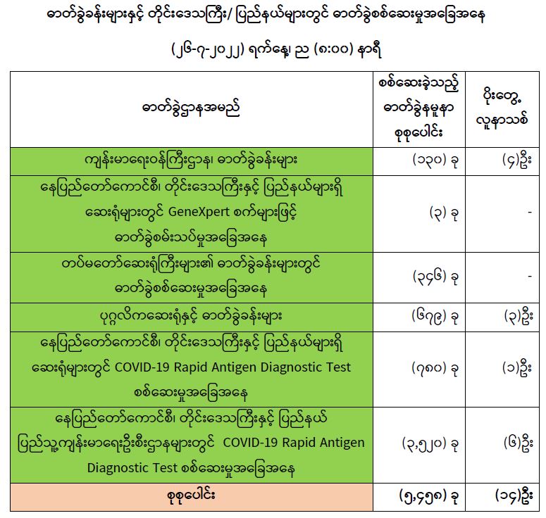 COVID-19 သံသယလူနာများ၊ ဓာတ်ခွဲအတည်ပြုလူနာနှင့် အနီးကပ်ထိတွေ့ခဲ့သူများနှင့် အသွားအလာကန့်သတ်ထားရှိသူများအား COVID-19 ရောဂါ ရှိ၊ မရှိ ဓာတ်ခွဲစစ်ဆေးခြင်း ပုံမှန်ဆောင်ရွက်လျက်ရှိပြီး (၂၅-၇-၂၀၂၂) ရက်နေ့၊ ည (၈:၀၀) နာရီမှ (၂၆-၇-၂၀၂၂) ရက်နေ့၊ ည (၈:၀၀) နာရီအတွင်း ဓာတ်ခွဲနမူနာစုစုပေါင်း (၅,၄၅၈) ခုအား စစ်ဆေးပြီးစီးခဲ့ရာ COVID-19 ရောဂါ ဓာတ်ခွဲအတည်ပြုလူနာသစ် (၁၄) ဦး တွေ့ရှိရပါသည်။ ထို့ကြောင့် ယနေ့အတွက် ရောဂါပိုးတွေ့ရှိမှု ရာခိုင်နှုန်းမှာ (၀.၂၆) ရာခိုင်နှုန်း ရှိပါသည်။