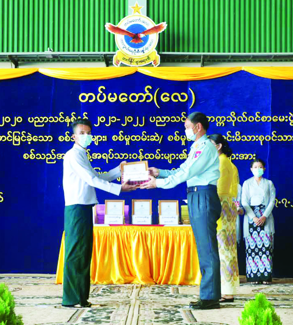၂၀၁၉ - ၂၀၂၀ ပညာသင်နှစ်နှင့် ၂၀၂၁ - ၂၀၂၂ ပညာသင်နှစ် တက္ကသိုလ်ဝင်စာမေးပွဲ၌ ထူးချွန်စွာ အောင်မြင်ခဲ့ကြသည့် တပ်မတော်(လေ)မှ စစ်သည်များ၊ စစ်မှုထမ်းဆဲ/ စစ်မှုထမ်းဟောင်း မိသားစုဝင်သားသမီးများ၊ စစ်သည်အစားခန့် အရပ်သားဝန်ထမ်းများ၏ သားသမီးများအား ဂုဏ်ပြုဆုချီးမြှင့်ခြင်း အခမ်းအနားကို ယနေ့ နံနက်ပိုင်းတွင် နေပြည်တော် လေတပ်စခန်း၌ကျင်းပရာ ကာကွယ်ရေးဦးစီးချုပ်(လေ) ဗိုလ်ချုပ်ကြီး ထွန်းအောင်နှင့် အရာရှိ/စစ်သည် မိသားစုများ၊ စစ်မှုထမ်းဟောင်းမိသားစုဝင်များ၊ တက္ကသိုလ်ဝင်စာမေးပွဲ၌ အောင်မြင်ခဲ့ကြသည့် စစ်သည်များ၊ ကျောင်းသား ကျောင်းသူများ၊ မိဘများနှင့် ဖိတ်ကြားထားသူများ တက်ရောက်ကြသည်။