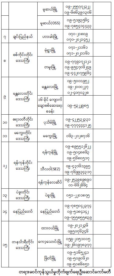 ၆။ သတင်းပေးဆက်သွယ် တိုင်ကြားနိုင်သည့် ဖုန်းနံပါတ်များမှာ အောက်ပါအတိုင်း ဖြစ်ပါသည်-