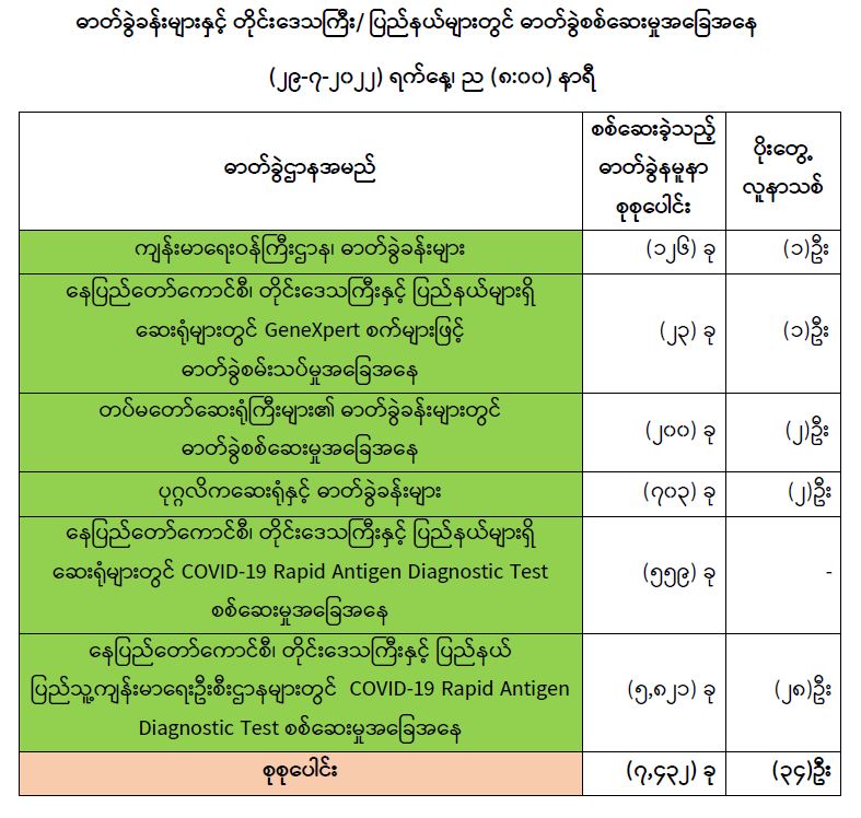 COVID-19 သံသယလူနာများ၊ ဓာတ်ခွဲအတည်ပြုလူနာနှင့် အနီးကပ်ထိတွေ့ခဲ့သူများနှင့် အသွားအလာကန့်သတ်ထားရှိသူများအား COVID-19 ရောဂါ ရှိ၊ မရှိ ဓာတ်ခွဲစစ်ဆေးခြင်း ပုံမှန်ဆောင်ရွက်လျက်ရှိပြီး (၂၈-၇-၂၀၂၂) ရက်နေ့၊ ည (၈:၀၀) နာရီမှ (၂၉-၇-၂၀၂၂) ရက်နေ့၊ ည (၈:၀၀) နာရီအတွင်း ဓာတ်ခွဲနမူနာစုစုပေါင်း (၇,၄၃၂) ခုအား စစ်ဆေးပြီးစီးခဲ့ရာ COVID-19 ရောဂါ ဓာတ်ခွဲအတည်ပြုလူနာသစ် (၃၄) ဦးတွေ့ရှိရပါသည်။ ထို့ကြောင့် ယနေ့အတွက် ရောဂါပိုးတွေ့ရှိမှု ရာခိုင်နှုန်းမှာ (၀.၄၆) ရာခိုင်နှုန်းရှိပါသည်။