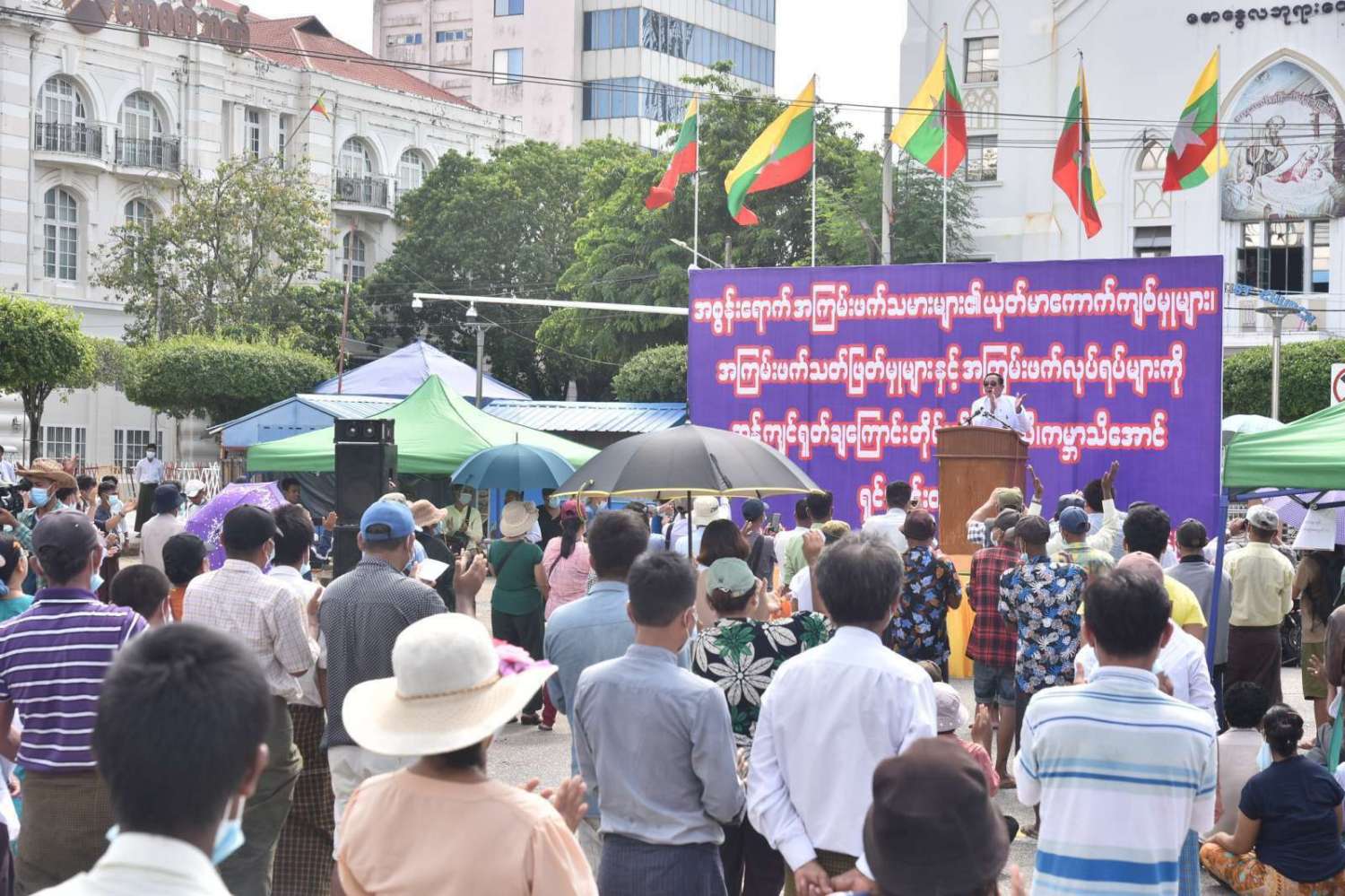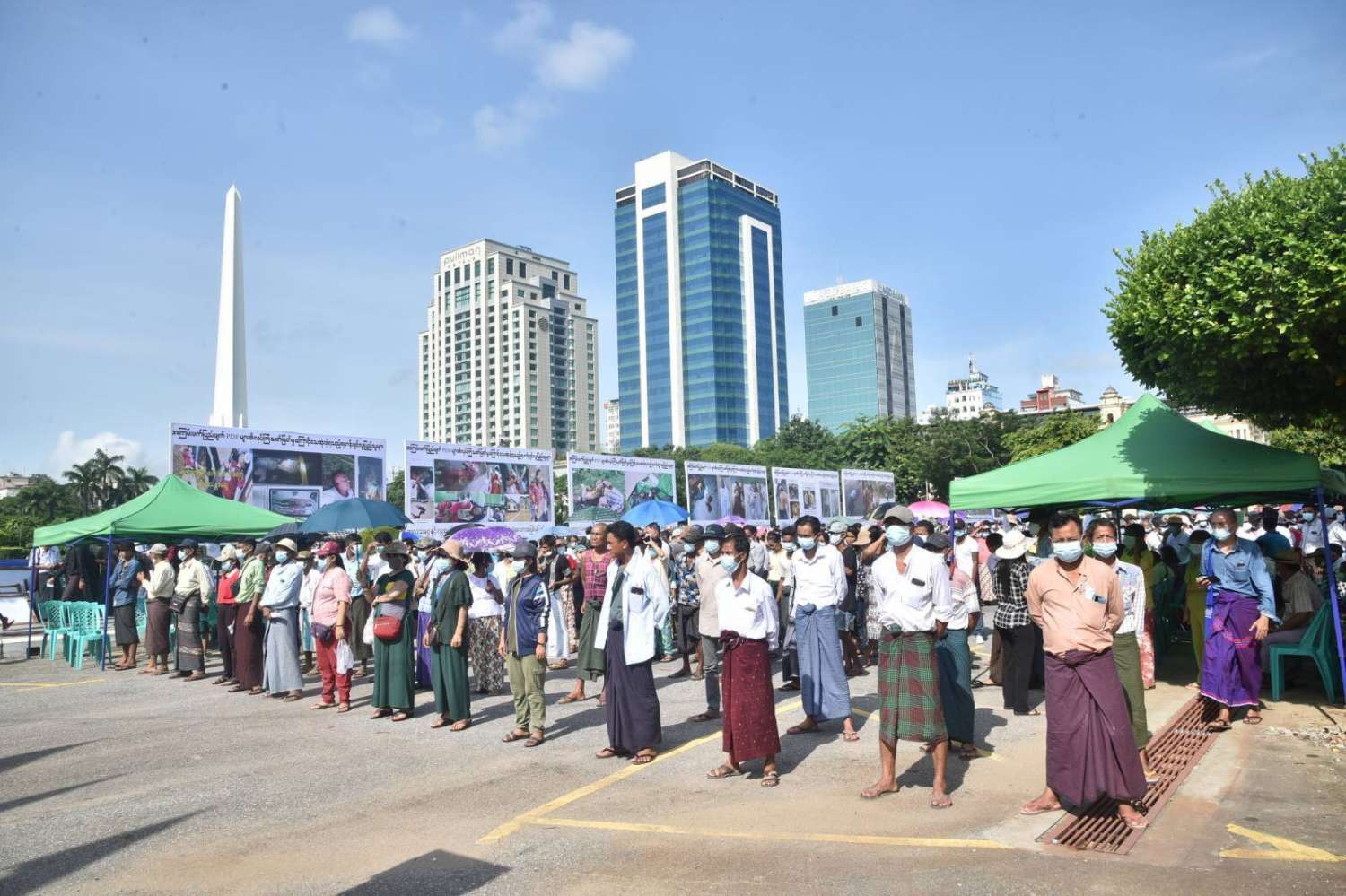 ယင်းနောက် တက်ရောက်လာကြသည့် အမျိုးသားရေးတက်ကြွလှုပ်ရှားသူများက ကြွေးကြော်သံများကို သံပြိုင်ကြွေးကြော်ခဲ့ကြပြီး အစွန်းရောက်အကြမ်းဖက်သမားများ၏ ယုတ်မာကောက်ကျစ်မှုများ၊ အကြမ်းဖက်သတ်ဖြတ်မှုများနှင့် အကြမ်းဖက်လုပ်ရပ်များကို ဆန့်ကျင်ရှုတ်ချကြောင်း တိုင်းသိ၊ ပြည်သိ၊ ကမ္ဘာသိအောင် ရှင်းလင်းထုတ်ဖော်ပွဲကို ရပ်နားခဲ့ကြသည်။
