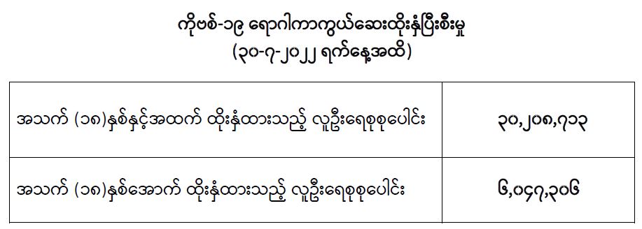 COVID-19 ရောဂါ ကာကွယ်ထိန်းချုပ်ရေးအတွက် တိုင်းဒေသကြီး/ပြည်နယ်များတွင် COVID-19 ရောဂါကာကွယ်ဆေးကို ဦးတည်အုပ်စုများသတ်မှတ်၍ ထိုးနှံပေးလျက်ရှိရာ (၃၀-၇-၂၀၂၂) ရက်နေ့အထိ အသက် (၁၈) နှစ်နှင့်အထက် လူဦးရေစုစုပေါင်း (၃၀,၂၀၈,၇၁၃)ဦးနှင့် အသက် (၁၈) နှစ်အောက် လူဦးရေစုစုပေါင်း (၆,၀၄၇,၃၀၆)ဦးတို့အား ထိုးနှံထားရှိပြီးဖြစ်ပါသည်။