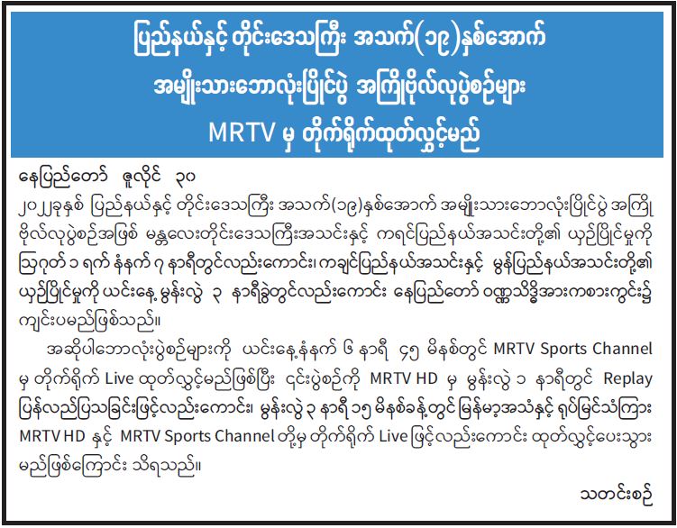 ပြည်နယ်နှင့် တိုင်းဒေသကြီး အသက်(၁၉)နှစ်အောက် အမျိုးသားဘောလုံးပြိုင်ပွဲ အကြိုဗိုလ်လုပွဲစဉ်များ MRTV မှ တိုက်ရိုက်ထုတ်လွှင့်မည် 08/01/2022 ပြည်နယ်နှင့် တိုင်းဒေသကြီး အသက်(၁၉)နှစ်အောက် အမျိုးသားဘောလုံးပြိုင်ပွဲ အကြိုဗိုလ်လုပွဲစဉ်များ MRTV မှ တိုက်ရိုက်ထုတ်လွှင့်မည်