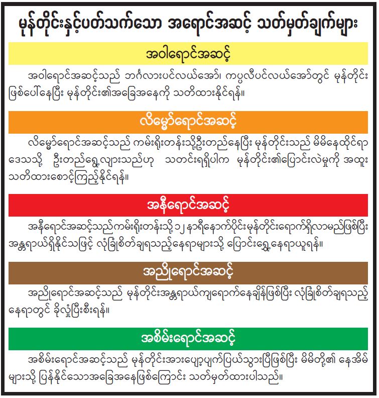 မုန်တိုင်းနှင့်ပတ်သက်သော အရောင်အဆင့် သတ်မှတ်ချက်များ 08/01/2022 မုန်တိုင်းနှင့်ပတ်သက်သော အရောင်အဆင့် သတ်မှတ်ချက်များ