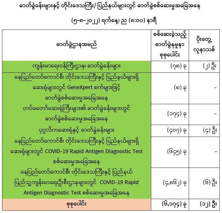 သို့ဖြစ်ပါ၍ ယနေ့အထိ ဓာတ်ခွဲနမူနာစုစုပေါင်း (၈,၅၆၅,၈၁၁)ခုအား စစ်ဆေးခဲ့ပြီး COVID-19 ဓာတ်ခွဲအတည်ပြုလူနာ စုစုပေါင်း (၆၁၄,၁၇၀) ဦး ရှိပြီဖြစ်ပါသည်။