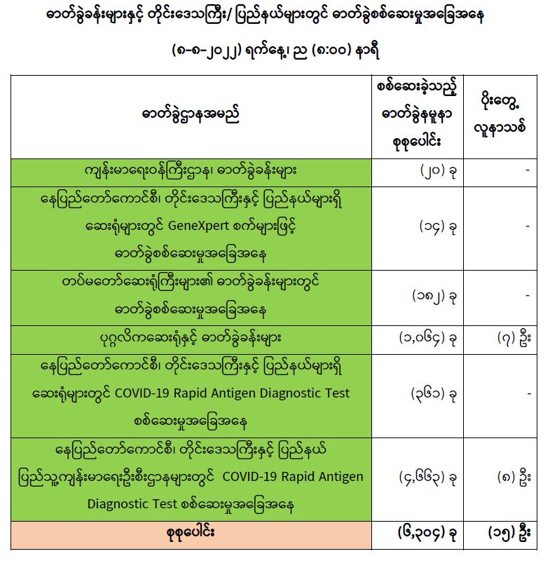 သို့ဖြစ်ပါ၍ ယနေ့အထိ ဓာတ်ခွဲနမူနာစုစုပေါင်း (၈,၅၈၂,၄၁၄) ခုအားစစ်ဆေးခဲ့ပြီး COVID-19 ဓာတ်ခွဲအတည်ပြုလူနာ စုစုပေါင်း (၆၁၄,၂၁၃) ဦး ရှိပြီဖြစ်ပါသည်။